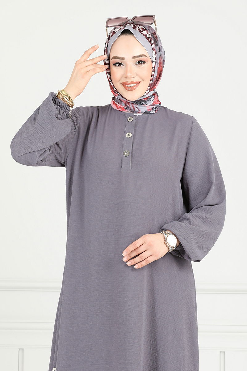 The Slit Buttoned Hijab Suit is suitable for all-season use. Offering a gentle wash at 30 degrees, this suit is made from lightweight and breathable Aerobin fabric. It features a bicycle neck and half-button design for practical use. The elastic waistband of the pants ensures a comfortable fit. The slit button design adds a stylish touch to the elegance. Together with its tunic and pants, this suit offers both comfort and elegance in daily wear.