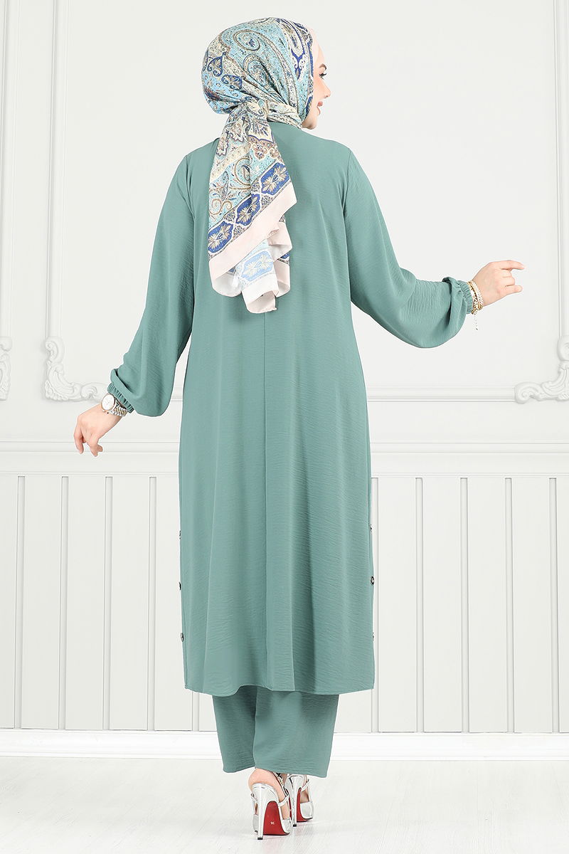 يتم ارتداء المنتج على الرأس. المنتج لديه ياقة دائرية. المنتج به أزرار نصف أمامي. الازرار الموجود بالفتحات اكسسوار. غير مبطنة. خصر البنطال مرن. السوار مطاطي. قد يكون هناك اختلاف في الدرجة اللونية في المنتج بسبب التقاط الصور الفوتوغرافية.