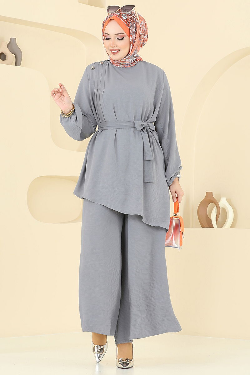 The Asymmetric Cut Aerobin Set offers a modern and stylish modest wear option. This outfit can be comfortably worn in all seasons and is washable at 30 degrees on a gentle cycle. Made from lightweight and breathable aerobin fabric, it ensures comfort throughout the day. The crew neck and unlined design maintains a minimalist look, while the decorative button on the back and the included belt enhance the ensemble’s elegance. The pants feature an elastic waist and cuffs for ease of wear. The belt is optional and can be removed as desired. With its tunic length and asymmetric cut, this set promises an elegant appearance in any setting.