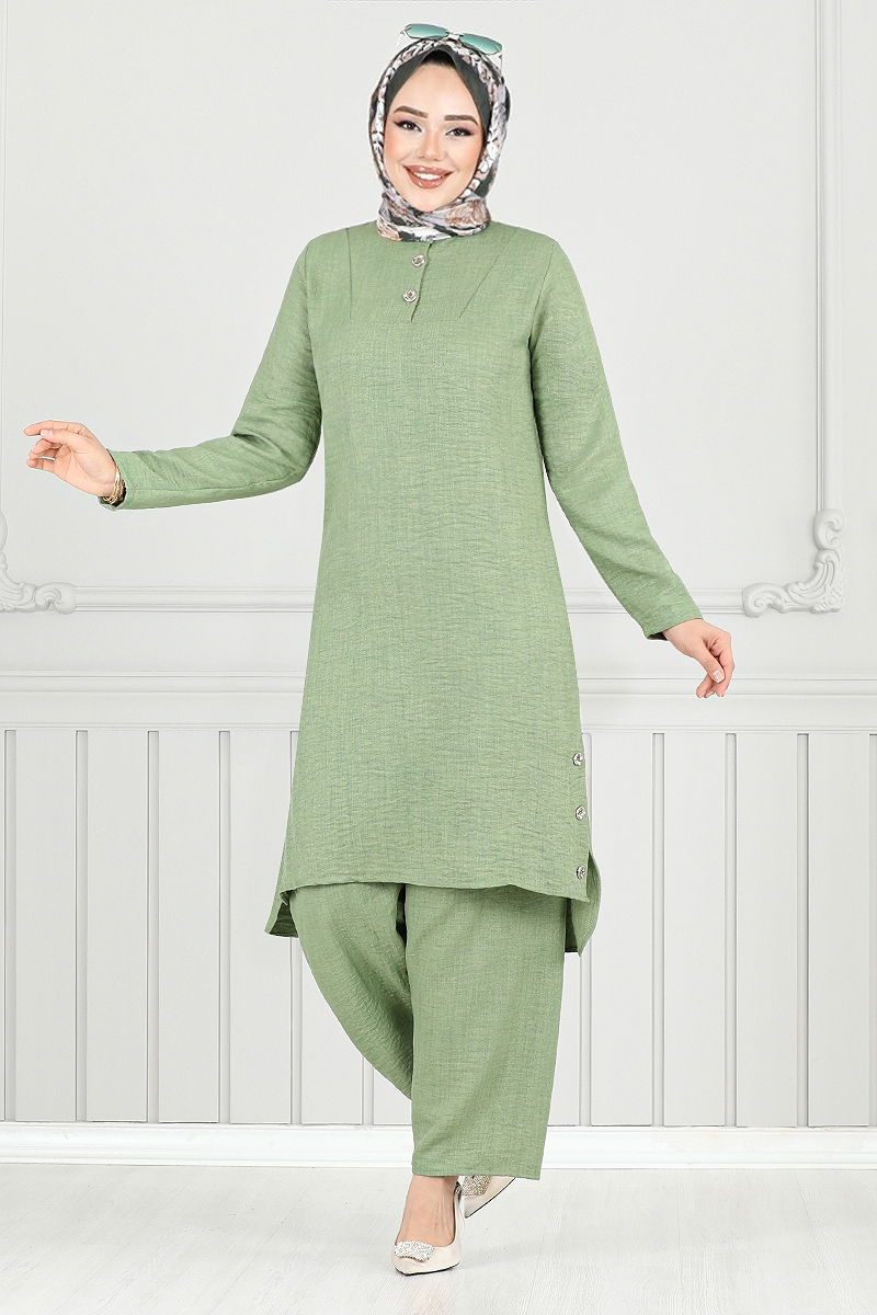 The Half-Buttoned Linen Suit KOMBIN offers unique design and comfort for all seasons. Made from Sofia Linen fabric, this suit can be easily cleaned with a gentle wash at 30 degrees. Its crew neck and half-buttoned front design combine elegance with practical use. The elastic waistband of the trousers ensures comfort throughout the day. This modern and stylish suit prioritizes elegance and comfort in modest fashion.
