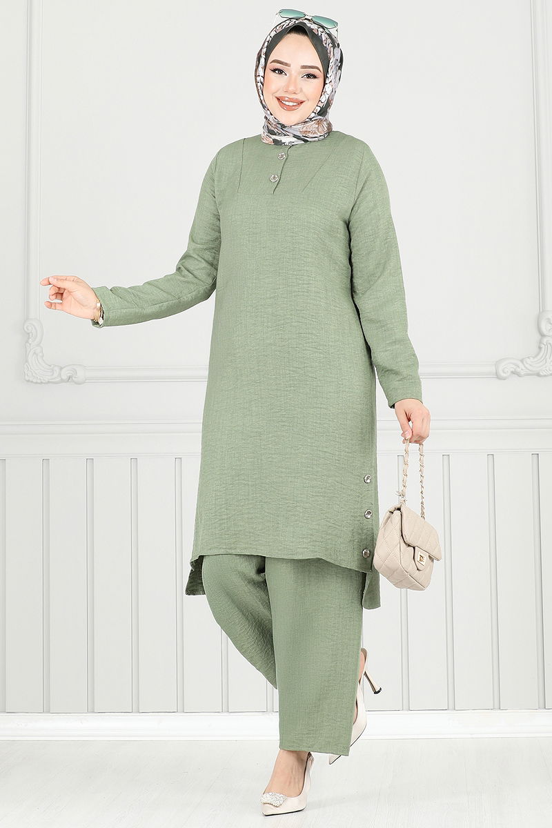 Product Feature : It is a new season hijab fashion product. The product has a Half Judge collar. The product has half front buttons. Slach buttons are an accessory.. Unlined. The waist of the trousers is elastic. There may be a tonal difference in the product due to concept photo shoots.
