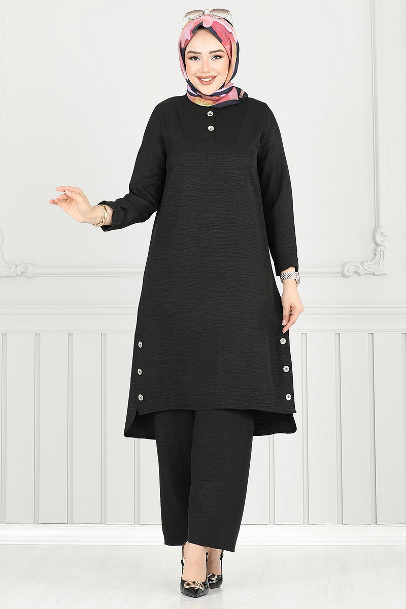 The Half-Buttoned Hijab Set is a timeless piece! Suitable for all seasons, this set offers ease of maintenance with its delicate wash feature and capability to be washed at 30 degrees. Made from Sofia Linen, it ensures a durable and stylish usage. The half stand collar and half-buttoned design provide both practicality and elegance, featuring slit buttons as decorative accessories. Its unlined structure offers a light and comfortable alternative. The elastic waist of the tunic and trousers ensures comfort throughout the day.