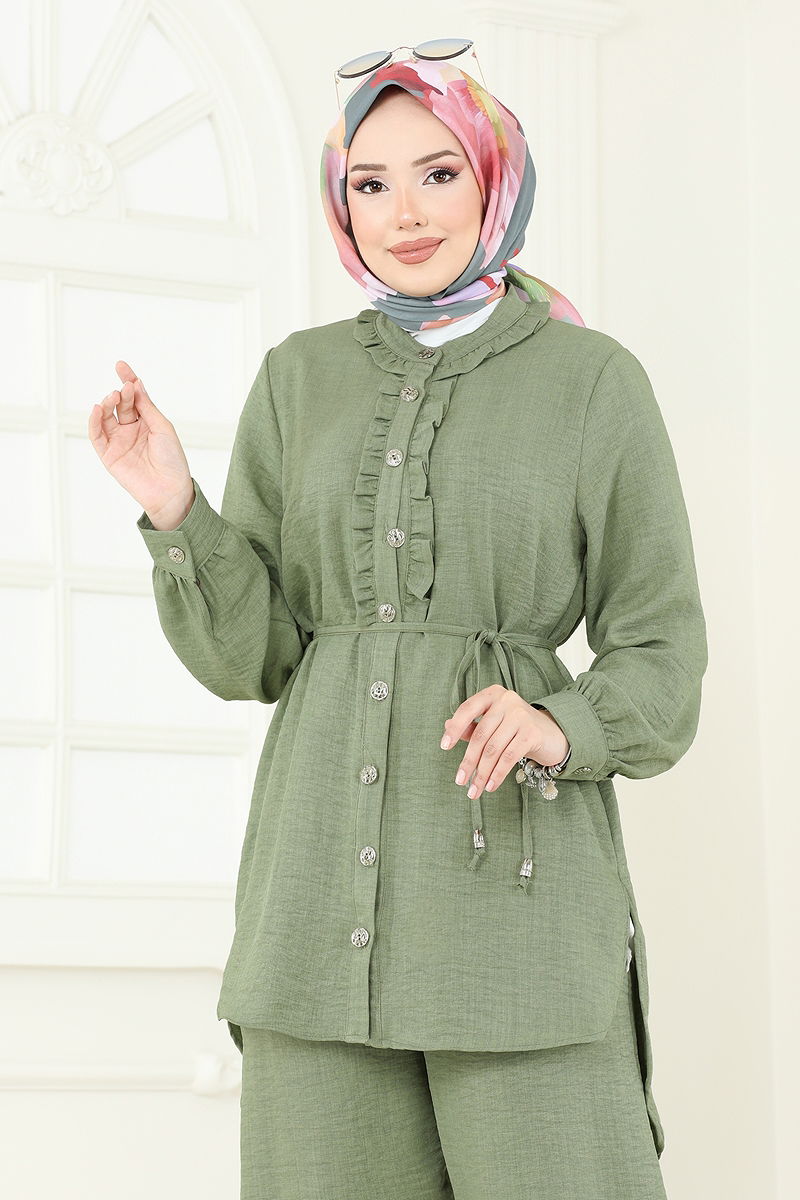 Sophia Set with frill details offers a combination of elegance and comfort as a hijab-friendly outfit. Suitable for all seasons, this product stands out with its 30-degree gentle wash feature. Made of linen, the Sophia Set provides practical use with its shirt collar and front-buttoned tunic. The side-slit tunic and the belt detail display a modern stance. The elastic waistband of the trousers ensures comfort throughout the day. The product is unlined, and its cuff buttons are actively usable. The belt comes as part of the set but can be optionally removed. The stylish design of the tunic and trousers makes it an ideal choice for both everyday and special occasions.