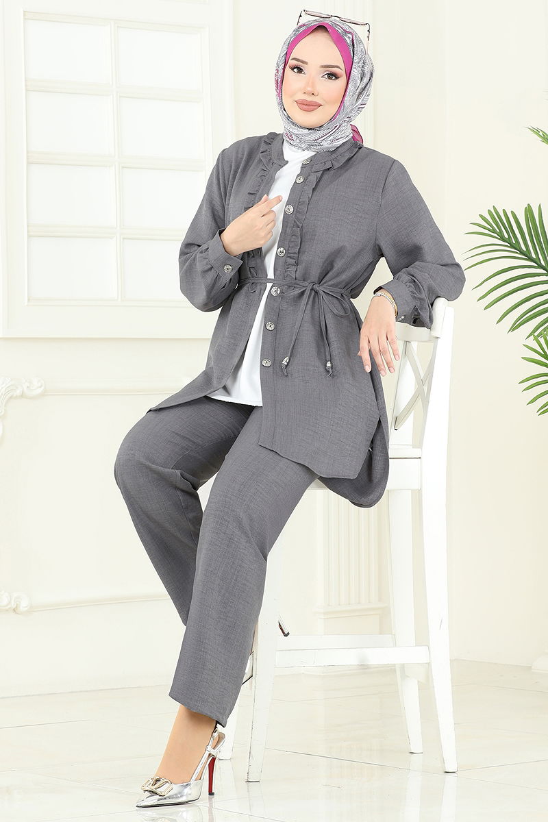 Sophia Set with frill details offers a combination of elegance and comfort as a hijab-friendly outfit. Suitable for all seasons, this product stands out with its 30-degree gentle wash feature. Made of linen, the Sophia Set provides practical use with its shirt collar and front-buttoned tunic. The side-slit tunic and the belt detail display a modern stance. The elastic waistband of the trousers ensures comfort throughout the day. The product is unlined, and its cuff buttons are actively usable. The belt comes as part of the set but can be optionally removed. The stylish design of the tunic and trousers makes it an ideal choice for both everyday and special occasions.