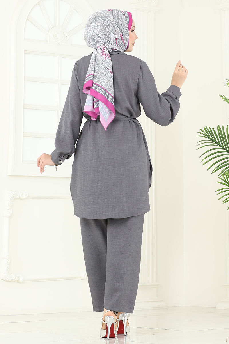 Product Feature : It is a new season hijab fashion product. The product has a Half Judge collar. The product has From the front buttons. The tunic has a side slash.. Unlined. The stones are glued. Belt included, optional not available. Blouse is not included. Sample combination is made with the blouse to show the intended use of the product. The waist of the trousers is elastic. Cuff buttons are active. There may be a tonal difference in the product due to concept photo shoots.