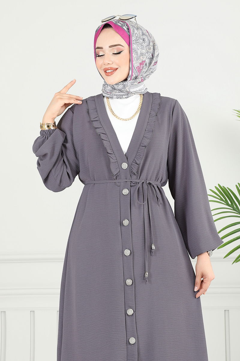 Product Feature : It is a new season hijab fashion product. The product has a V Neck collar. The product has From the front buttons. Unlined. Belt included, optional not available. Blouse is not included. Sample combination is made with the blouse to show the intended use of the product. Accessories are not included. The waist of the trousers is elastic. The cuff is rubberized. There may be a tonal difference in the product due to concept photo shoots.