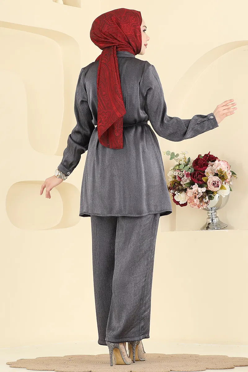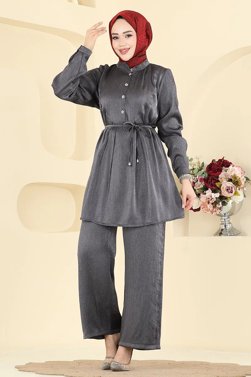 The Laced Shiny Taffeta Suit Set is a modest fashion ensemble perfect for all seasons. This product, which can be washed gently at 30 degrees, is made from shiny taffeta fabric. Featuring a half mandarin collar and semi-buttoned front design, the tunic is unlined, while the pants feature an elastic waistband and pockets for comfort. The lace accessory is optional and can be removed if desired.