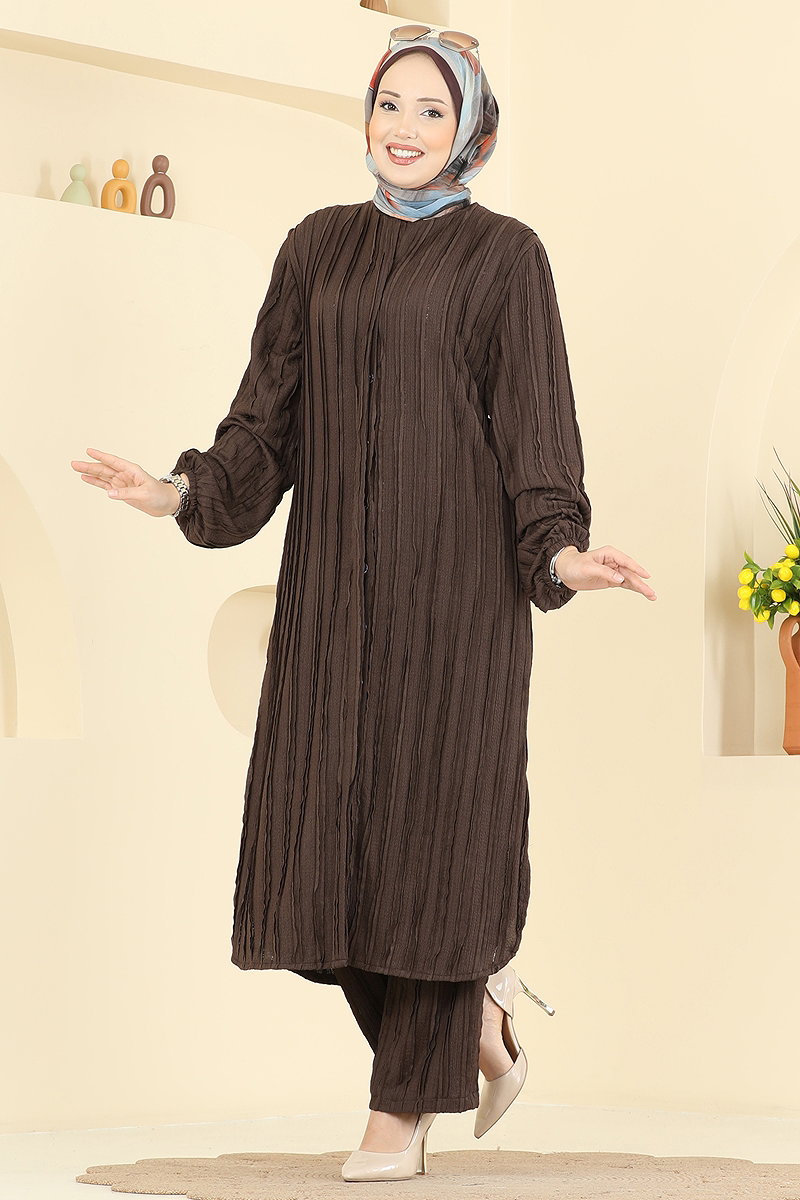 This chic and modern Side-Slit Crinkle Set COMBINE is an impressive option to complete your modest wear style. Suitable for all seasons, this set is durable thanks to its special crinkle fabric. It adds elegance with its bicycle neckline and button-front tunic design. The pants' elastic waist provides comfort throughout the day. It is easy to care for with its machine washable at 30 degrees feature for delicate clothes. The elastic cuffs on the tunic and pants ensure freedom of movement.