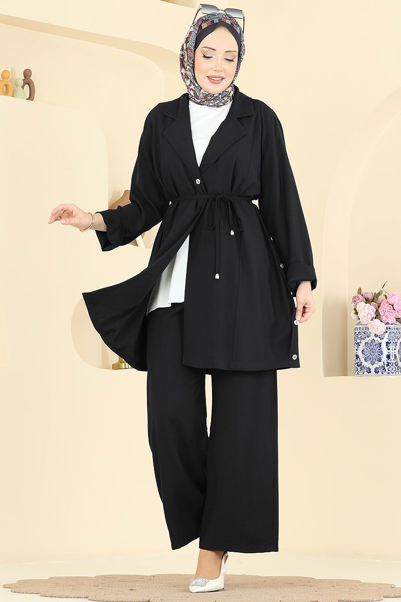 Product Feature : It is a new season hijab fashion product. The product has a Double-breasted collar. The product has From the front buttons. Belt included, optional not available. Buttons are accessories. The waist of the trousers is elastic. There may be a tonal difference in the product due to concept photo shoots.