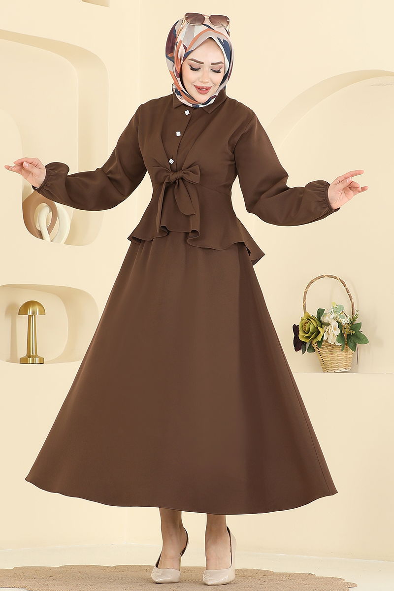 يوجد حزام يمكن استخدامه من الأمام. المنتج لديه ياقة القميص. المنتج به أزرار نصف أمامي. غير مبطنة. يتم خياطة الحزام على المنتج. .خصر التنورة مرن السوار مطاطي. قد يكون هناك اختلاف في الدرجة اللونية في المنتج بسبب التقاط الصور الفوتوغرافية.