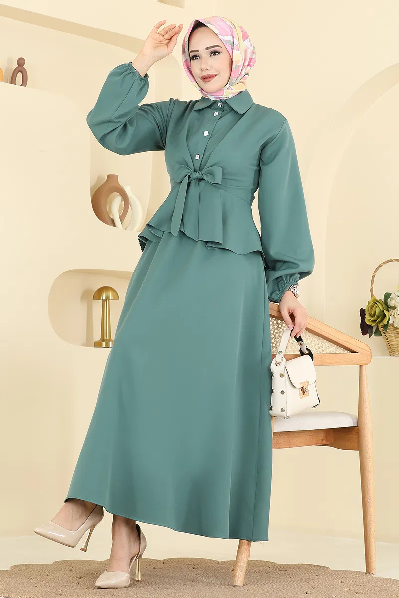 يوجد حزام يمكن استخدامه من الأمام. المنتج لديه ياقة القميص. المنتج به أزرار نصف أمامي. غير مبطنة. يتم خياطة الحزام على المنتج. .خصر التنورة مرن السوار مطاطي. قد يكون هناك اختلاف في الدرجة اللونية في المنتج بسبب التقاط الصور الفوتوغرافية.