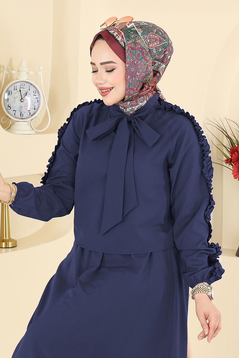 المنتج لديه ياقة نصف بيضوية. غير مبطنة. التفاصيل مخيطة. المنتج بأربطة. .خصر التنورة مرن السوار مطاطي. قد يكون هناك اختلاف في الدرجة اللونية في المنتج بسبب التقاط الصور الفوتوغرافية.