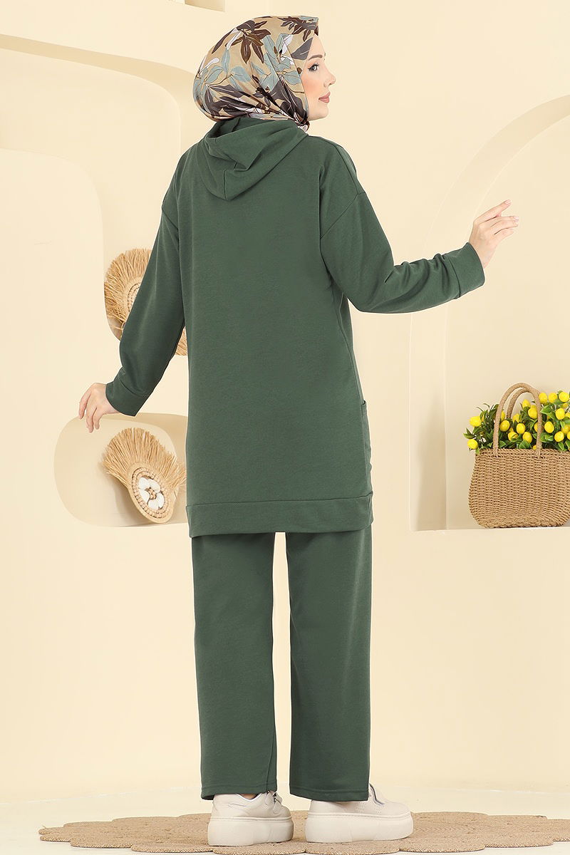 Extremely comfortable and stylish, our Hooded Sport Set is a modest ensemble that can be worn in all four seasons. Made from dual yarn fabric, this set is both high-quality and durable. Comprising a tunic and pants, it can be washed gently at 30 degrees and is easy to maintain. The product features a hooded neckline and is unlined. The product size displayed on the model is 38, indicating a flexible fit that can accommodate various body types.