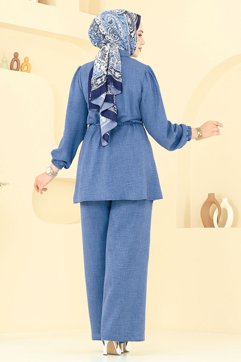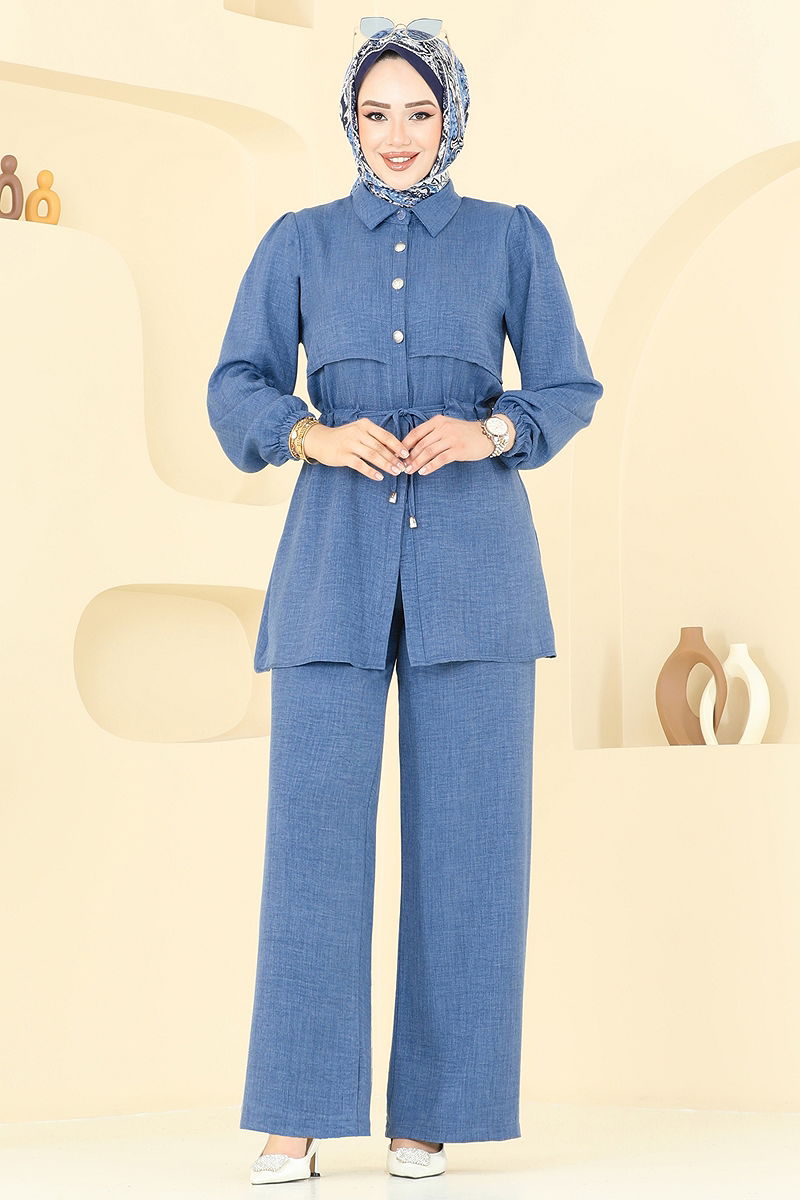 The Belted Tunnel Sofia Set is an excellent choice for stylish hijab apparel, suitable for wearing all seasons. It should be washed gently at 30 degrees Celsius. Made from linen fabric, this set features a shirt collar and front-button design that offers a modern and chic appearance. The product is unlined and the cuffs are elasticized. Comprised of a tunic and trousers, this ensemble is perfect for both meetings and everyday wear. Note that the blouse is not included; it is styled with the set only for visual purposes. The trousers have an elastic waist, providing maximum comfort.