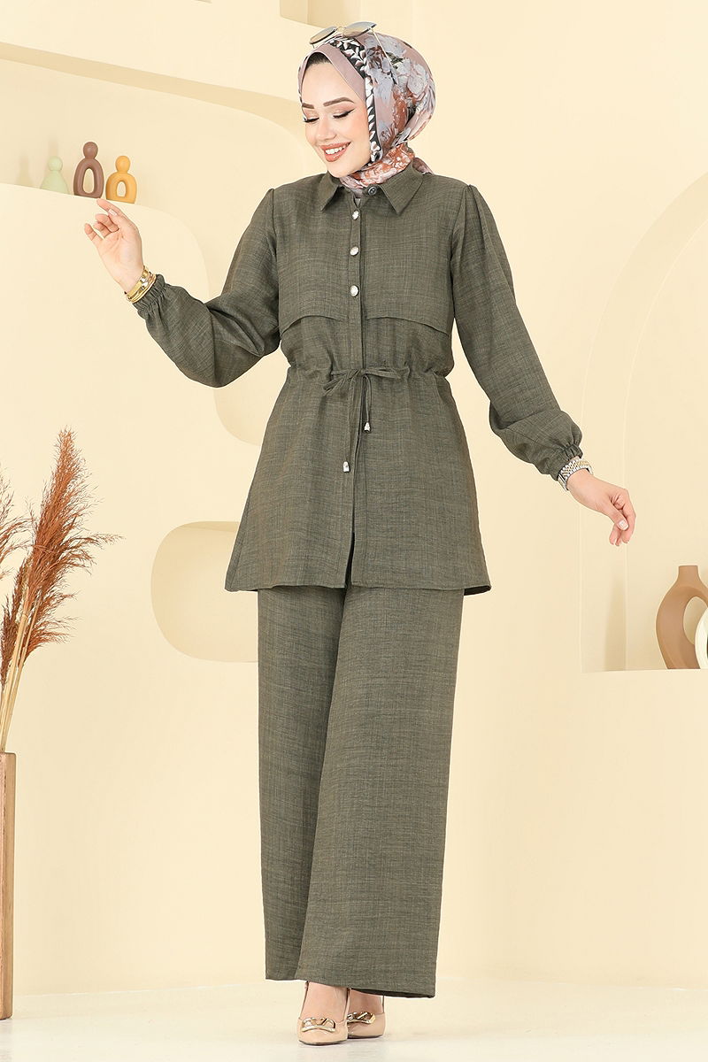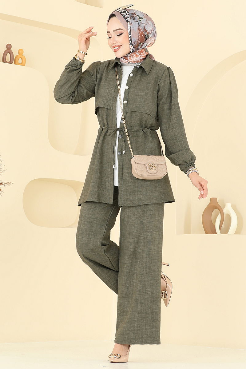 The Belted Tunnel Sofia Set is an excellent choice for stylish hijab apparel, suitable for wearing all seasons. It should be washed gently at 30 degrees Celsius. Made from linen fabric, this set features a shirt collar and front-button design that offers a modern and chic appearance. The product is unlined and the cuffs are elasticized. Comprised of a tunic and trousers, this ensemble is perfect for both meetings and everyday wear. Note that the blouse is not included; it is styled with the set only for visual purposes. The trousers have an elastic waist, providing maximum comfort.