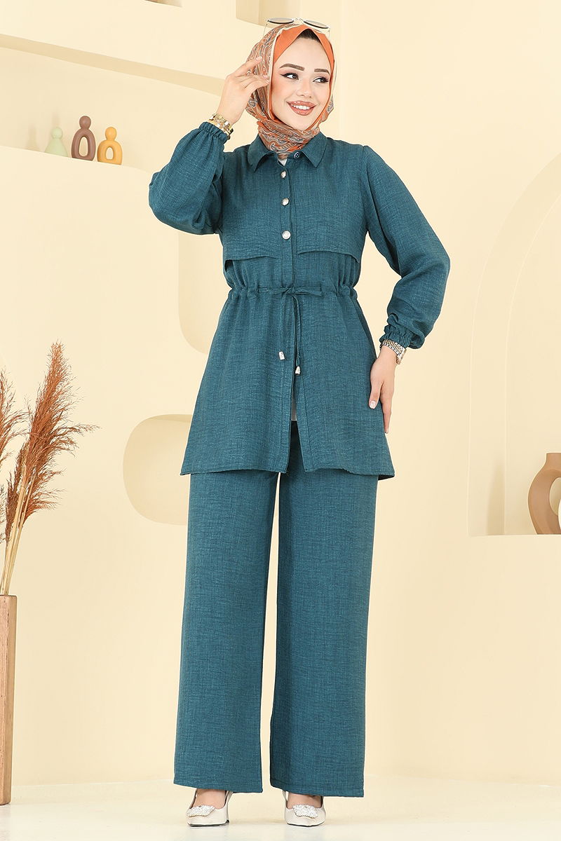 يتميز بخصر ذو أربطة. المنتج لديه ياقة القميص. المنتج به أزرار من الأمام. غير مبطنة. التفاصيل مخيطة. البلوزة غير متضمنة. صُنعت عينة من المجموعة مع البلوزة لإظهار الاستخدام المقصود للمنتج. خصر البنطال مرن. السوار مطاطي. قد يكون هناك اختلاف في الدرجة اللونية في المنتج بسبب التقاط الصور الفوتوغرافية.