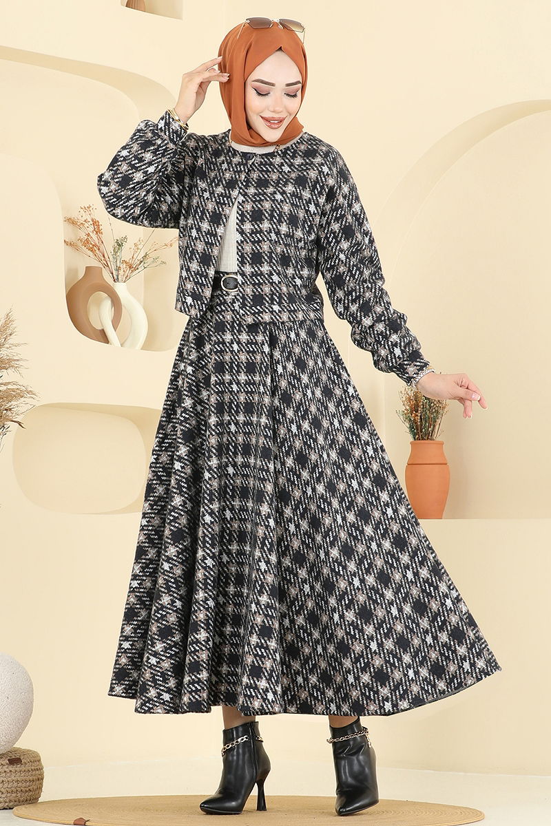 The Jacketed Winter Hijab Suit COMBINE model is a hijab product. It can be used in Autumn and Winter seasons. It should be washed at 30 degrees without squeezing. It is made of first-class Winter Knitted fabric. The product has a Bicycle collar and is buttoned from the front. It is liningless. The product has a side zip. (The product on the model is size 38.) The skirt waist is side-zipped and half elasticated. JACKET and SKIRT