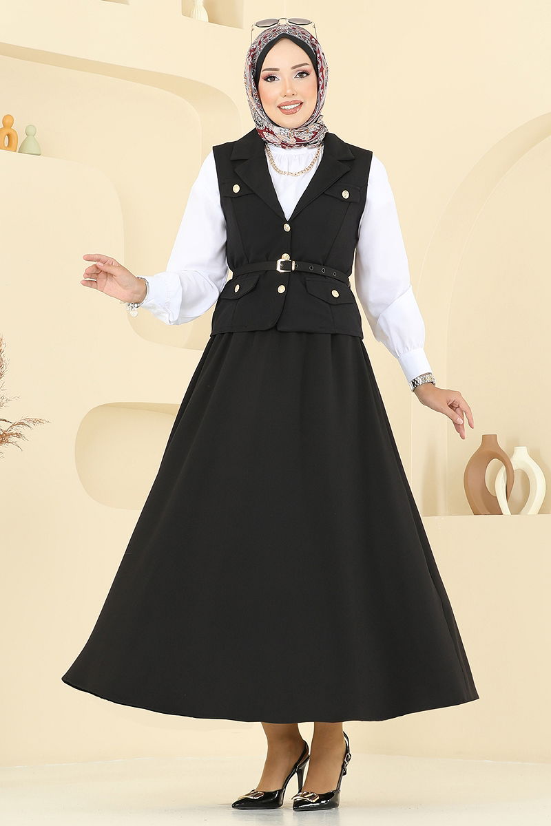 With its chic and modern design, the Vest Skirt Hijab Suit is an ideal choice that you can enjoy every season. Made of terrycotton and double fabric, this special design offers both comfort and elegance together. The product stands out with its comfortable semi Mandarin collar and unlined structure. The skirt part, which provides ease of use with a zipper detail at the back, has an elastic waist design. The pocket details and cuff buttons on the jacket add functionality, completing your style. This combination, which can be comfortably used in all seasons, can be cleaned with sensitive washing. Express your style with this product, presented in size 38.