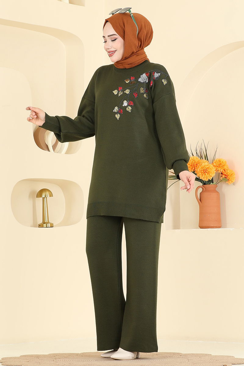 يتم ارتداء المنتج على الرأس. المنتج لديه ياقة دائرية. غير مبطنة. تفاصيل الطوابع مخيطة. تفاصيل الخرز مخيطة خصر البنطال مرن. قد يكون هناك اختلاف في الدرجة اللونية في المنتج بسبب التقاط الصور الفوتوغرافية.