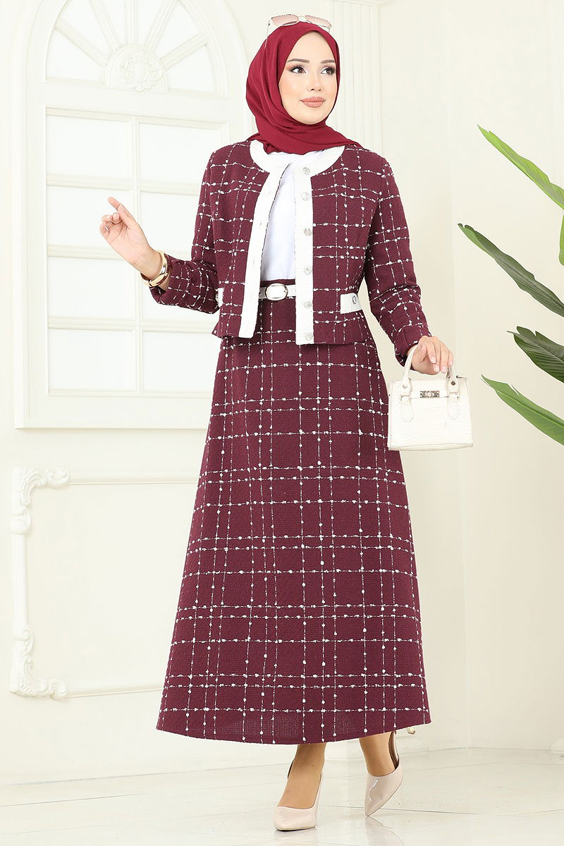 Jacketed Tweed Two-Piece model modest clothing item. It can be used in Autumn and Winter season. It should be washed at 30 degrees without squeezing. It is made of first class Tweed fabric. The product has a Bicycle collar. The product is buttoned from the front. It is unlined. The product has a zip at the waist. (The product on the model is size 38.) There are usable buttons at the front. The waist of the skirt has a zip from the back.