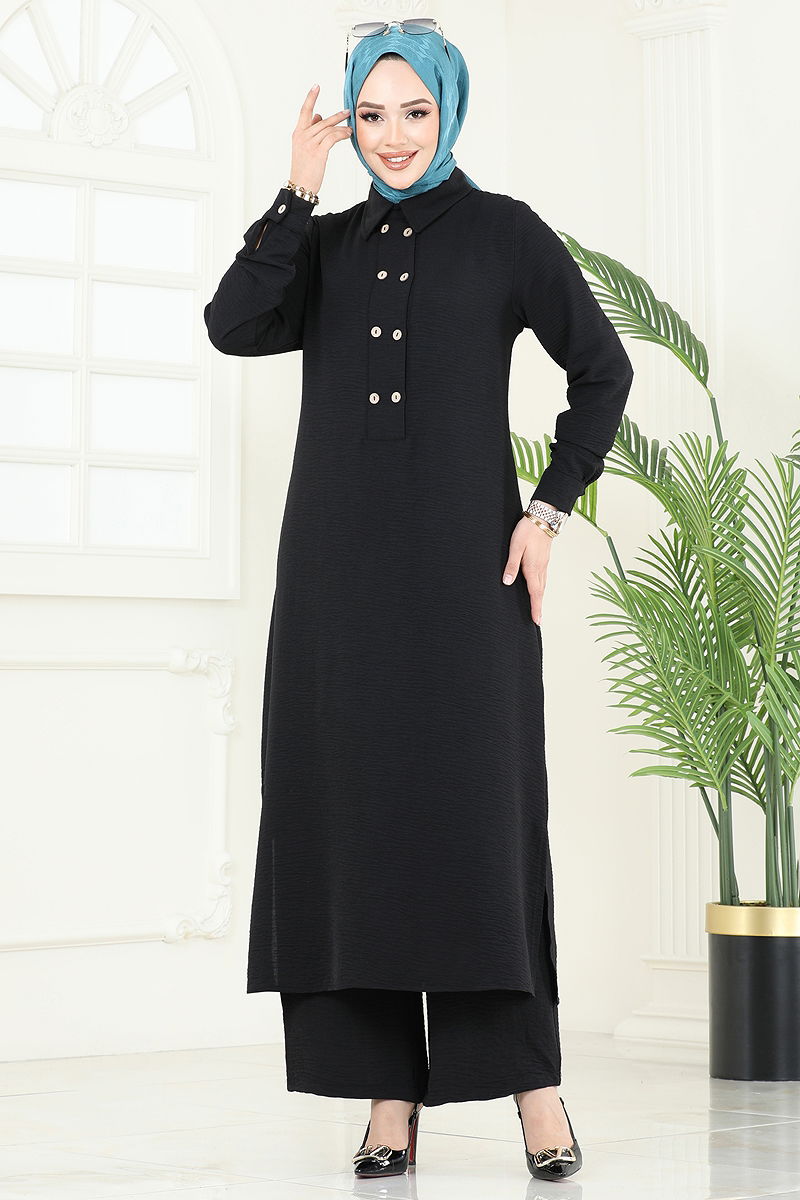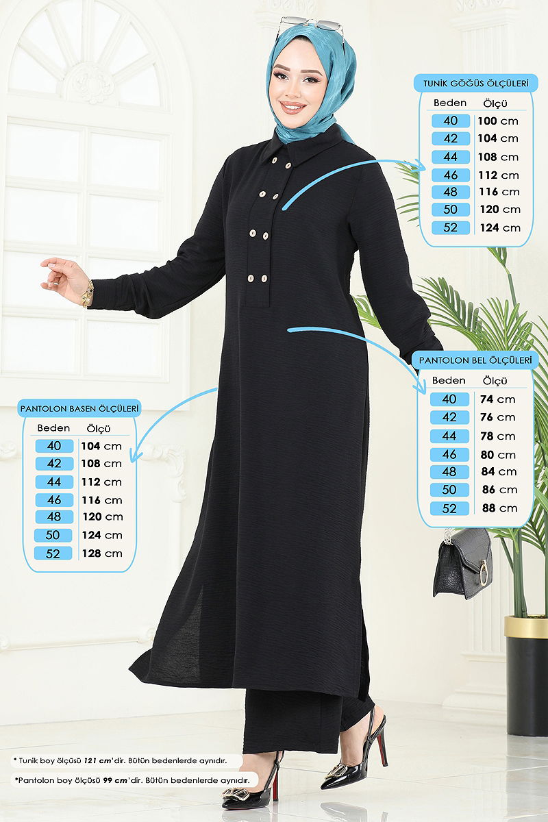 The Front-Buttoned Aerobin Set is designed to bring the elegance of modest fashion to all four seasons. Washable at 30 degrees with its sensitive touch, this outfit provides comfort throughout the day with its soft Aerobin fabric. Featuring a shirt collar and a side-slit tunic for a modern look, and elastic waist pants for enhanced comfort, it's perfect for those seeking coziness and elegance in every setting. The active buttons on the cuffs complete the chic appearance.