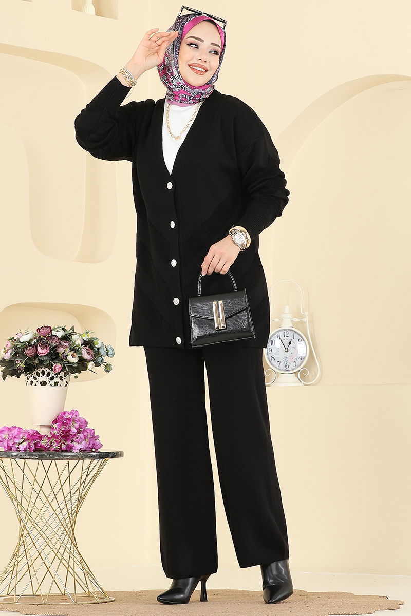 المنتج لديه ياقة ياقة V. المنتج به أزرار من الأمام. غير مبطنة. البلوزة غير متضمنة. صُنعت عينة من المجموعة مع البلوزة لإظهار الاستخدام المقصود للمنتج. خصر البنطال مرن. قد يكون هناك اختلاف في الدرجة اللونية في المنتج بسبب التقاط الصور الفوتوغرافية.