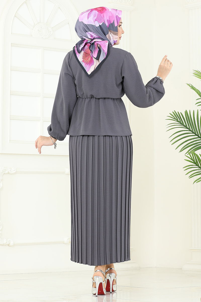Stylish and modern, the Belted Skirt Suit is a versatile modest wear suitable for all seasons. This suit, which can be washed at 30 degrees without wringing, is made from aerobin fabric, offering a soft texture. With a shirt collar design and front half-buttoned blouse, it combines elegance with practical use. The product features a zipper at the back and is unlined for a light and comfortable experience. Equipped with an elastic and tied waist design on the skirt, this ensemble ensures a perfect fit for any size. Complete your style with the combination's blouse and skirt along with a belt sewn on the skirt.
