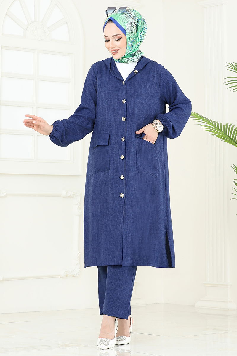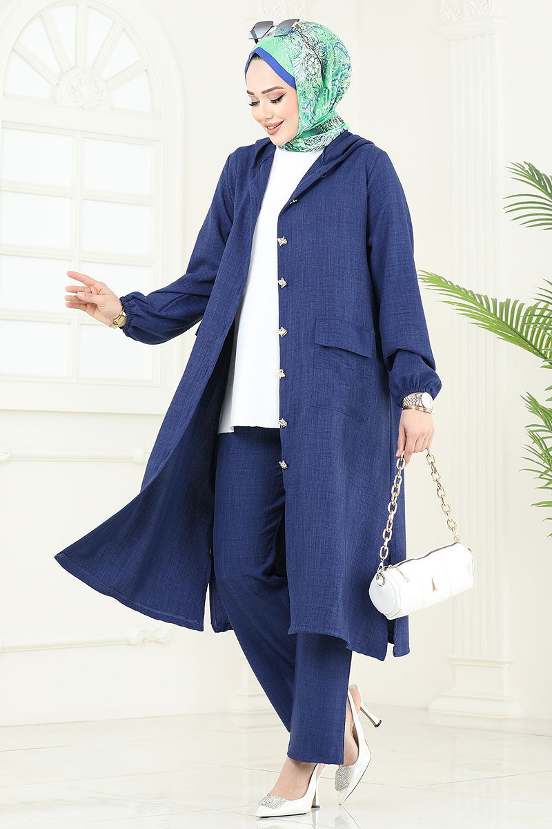 The Button-Front Linen Suit is a modest apparel suitable for all seasons. Crafted from special Sofia linen fabric, this elegant suit is suitable for delicate wash and can be washed at 30 degrees Celsius. It offers practicality with its hooded collar and button-front design. The slit and unlined structure provide a comfortable range of motion. The set is complemented by an elastic waistband on the pants and an attached hood, making it both functional and modern. The suit features pockets on both the jacket and pants, with elastic details at the cuffs, adding to its versatility and contemporary appeal.