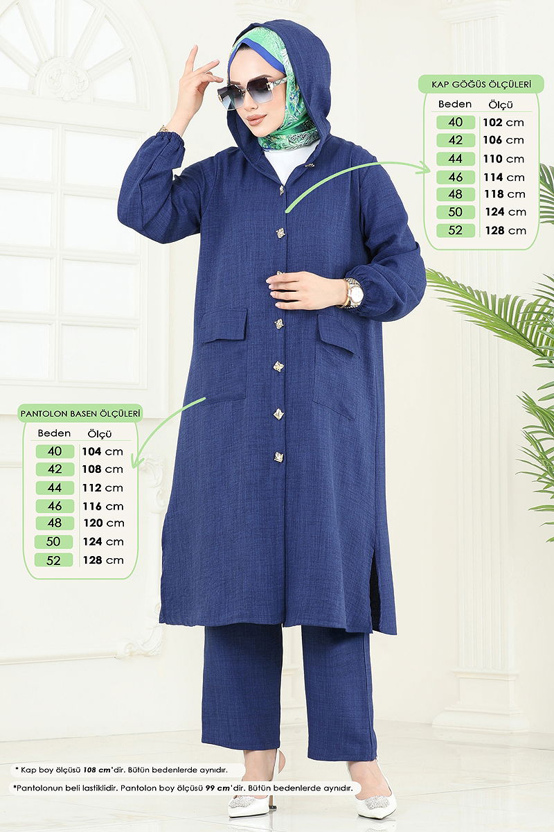 المنتج لديه ياقة مع قبعة. المنتج به أزرار من الأمام. يحتوي على فتحة. غير مبطنة. تم خياطة القبعة مع المنتج الجيب متاح. خصر البنطال مرن. السوار مطاطي. قد يكون هناك اختلاف في الدرجة اللونية في المنتج بسبب التقاط الصور الفوتوغرافية.