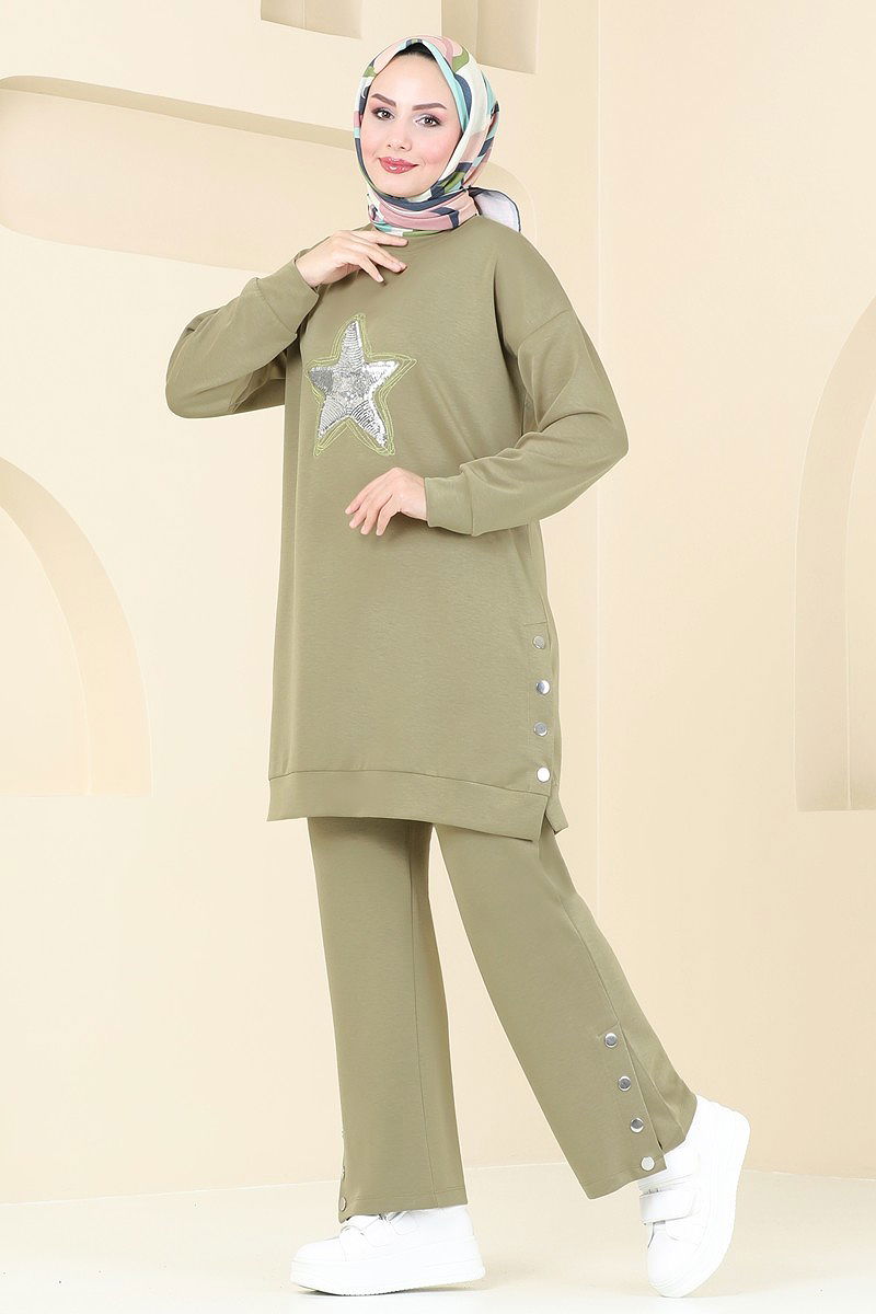 Product Feature : It is a new season hijab fashion product. The product has a Cycling collar. The slash has a snap fastener.. Unlined. The sequin detail is sewn. Pants have elastic waist. Slit detail. There may be a tonal difference in the product due to concept photo shoots.