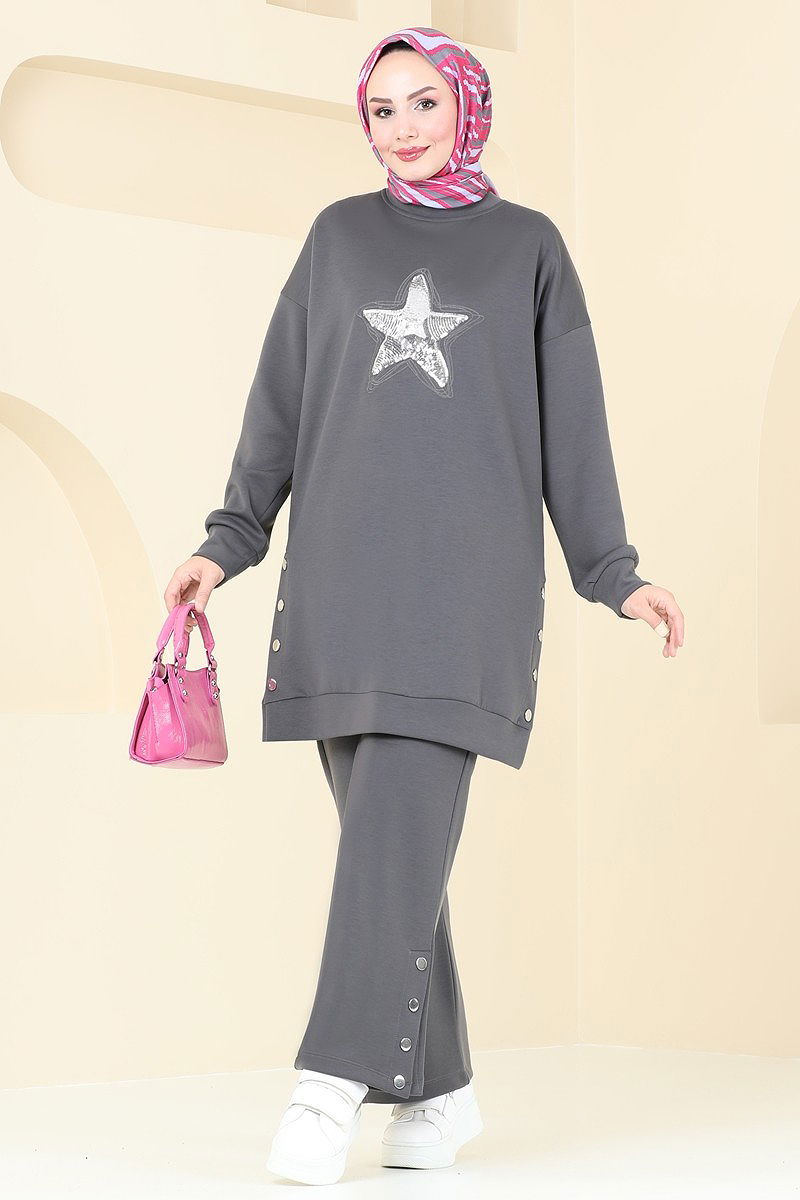 المنتج لديه ياقة دائرية. الفتحة تحتوي لصقات. غير مبطنة. تفاصيل الطوابع مخيطة. يتميز البنطال بخصر مطاطي. تفاصيل الشق. قد يكون هناك اختلاف في الدرجة اللونية في المنتج بسبب التقاط الصور الفوتوغرافية.