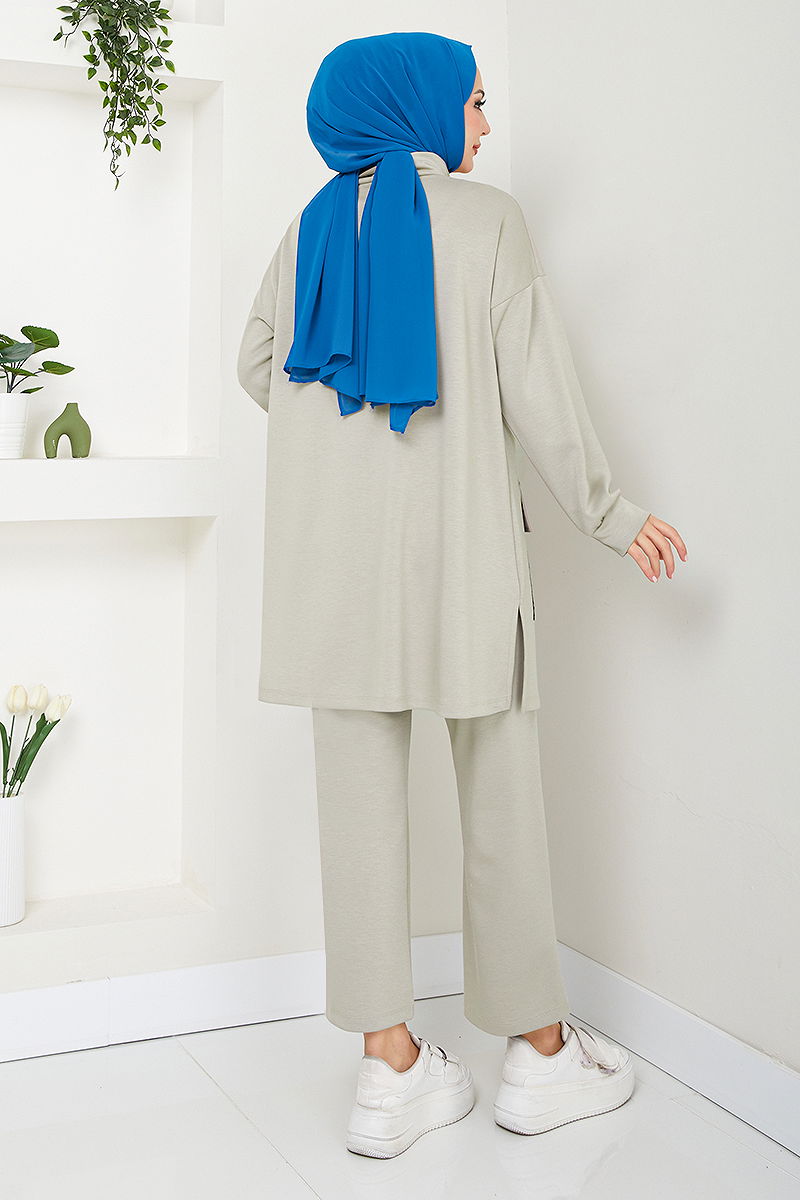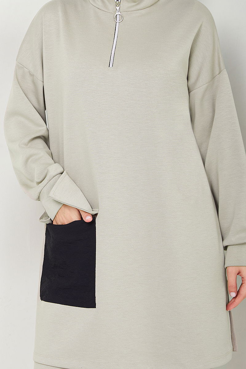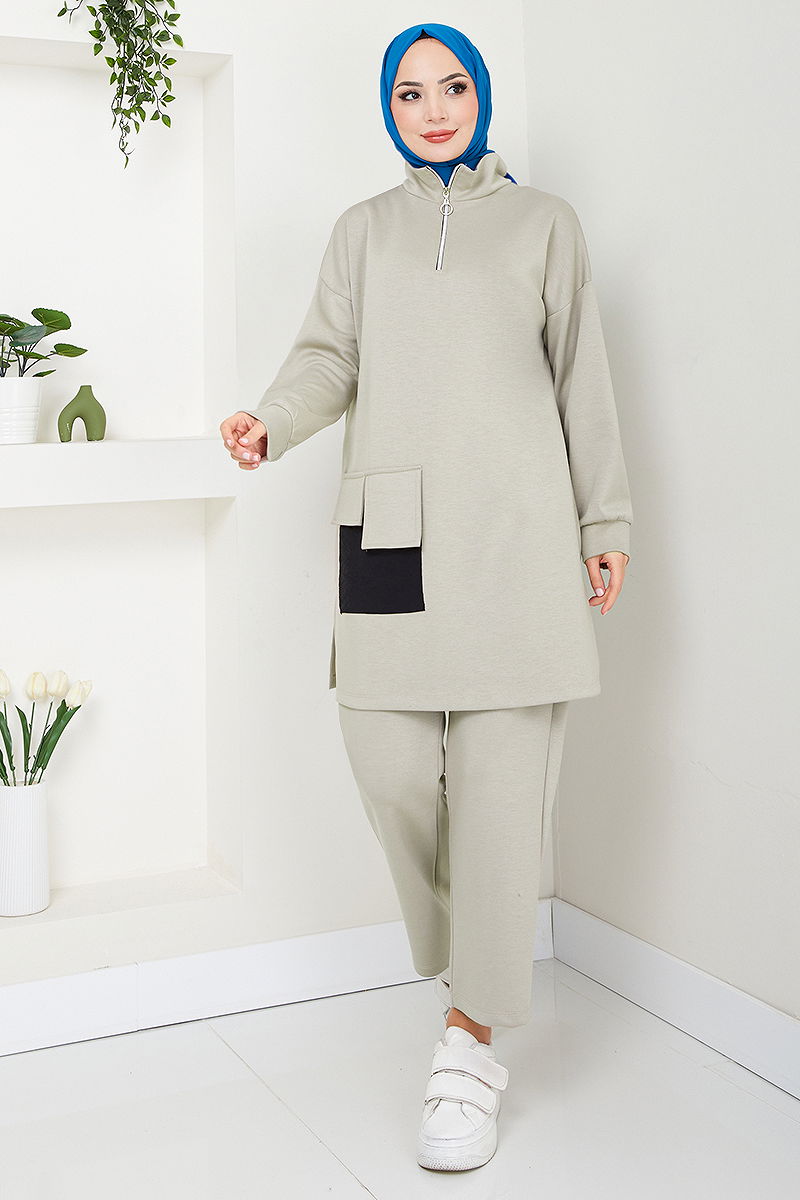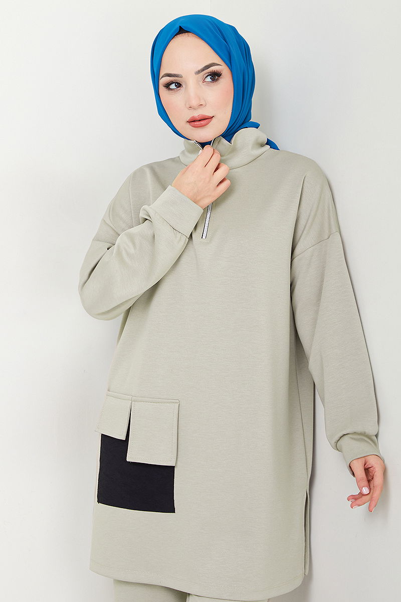 Half-Zip Oyso Suit model is a hijab product. It can be used in Autumn and Winter seasons. It should be washed at 30 degrees without spinning. It is made of first-class Oyso fabric. The product has a straight collar. It's unlined. (The product on the model is size S.) The zipper detail is active. The pants have elastic waist. There is a pocket on the tunic.
