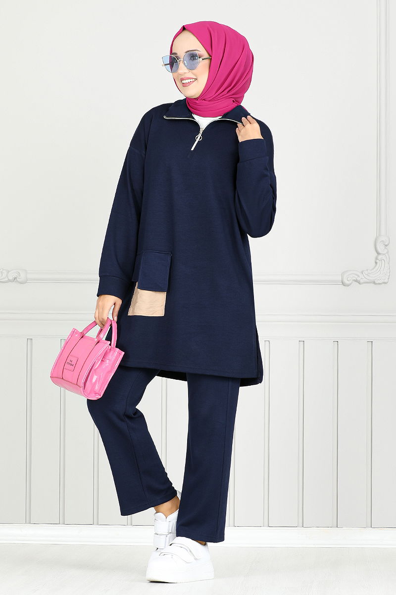 Half-Zip Oyso Suit model is a hijab product. It can be used in Autumn and Winter seasons. It should be washed at 30 degrees without spinning. It is made of first-class Oyso fabric. The product has a straight collar. It's unlined. (The product on the model is size S.) The zipper detail is active. The pants have elastic waist. There is a pocket on the tunic.