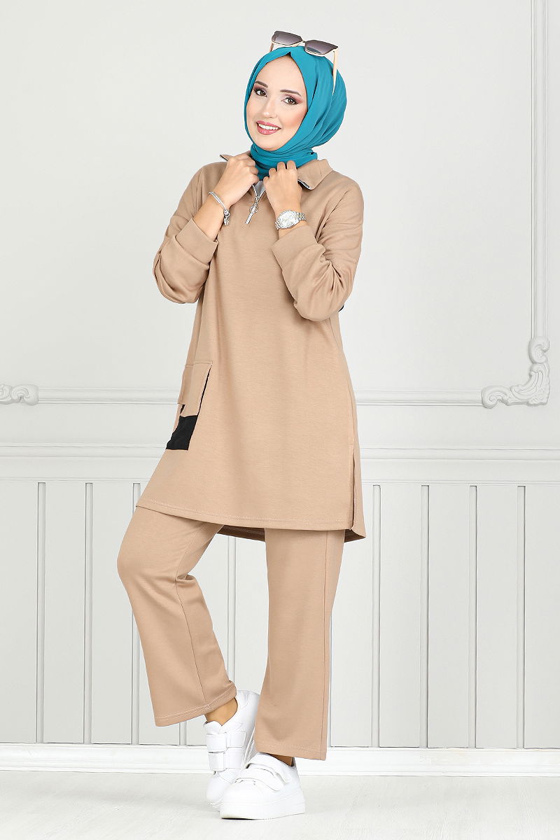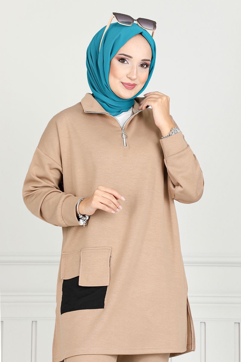 Half-Zip Oyso Suit model is a hijab product. It can be used in Autumn and Winter seasons. It should be washed at 30 degrees without spinning. It is made of first-class Oyso fabric. The product has a straight collar. It's unlined. (The product on the model is size S.) The zipper detail is active. The pants have elastic waist. There is a pocket on the tunic.