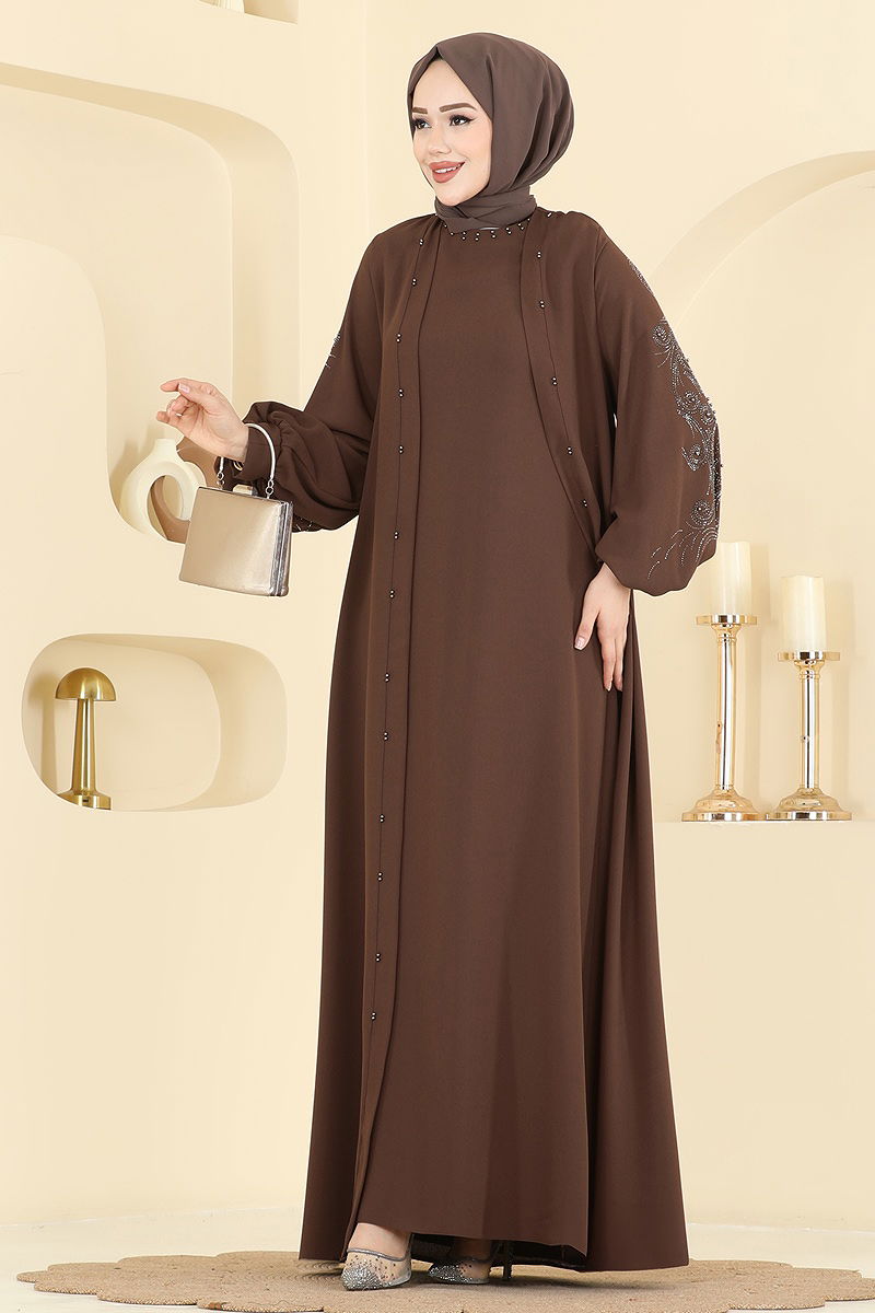 Enhance your elegance and style on special occasions with our Stone-Detailed Abaya Set, a modest wear suitable for all seasons. This product, which should only be dry cleaned, offers comfort with its bike neck and unlined design. Its back-zipper design makes it easy to wear, while the bead and stone details add a sparkling touch. The inner dress is sleeveless and the set is suitable for wearing as both abaya and dress.