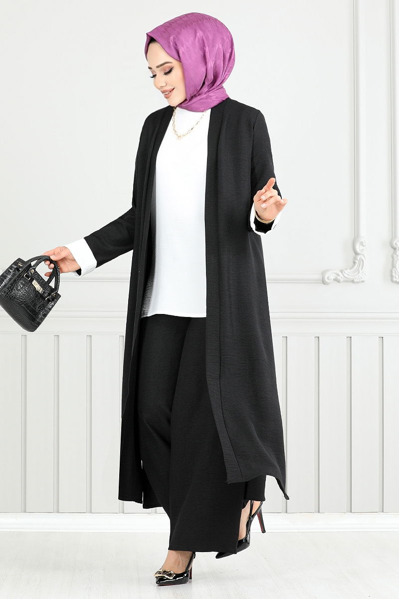The stylish and practical Slit Triple Set is a modest wear model that can be comfortably chosen for all seasons. Washable at 30 degrees on a gentle cycle, this product is made from breathable Sofia Linen fabric. Featuring a jacket collar and slit details, this set offers a liner-free and comfortable wearing experience. The elasticated waist of the pants ensures a comfortable fit. This triple set includes a cape, blouse, and trousers.