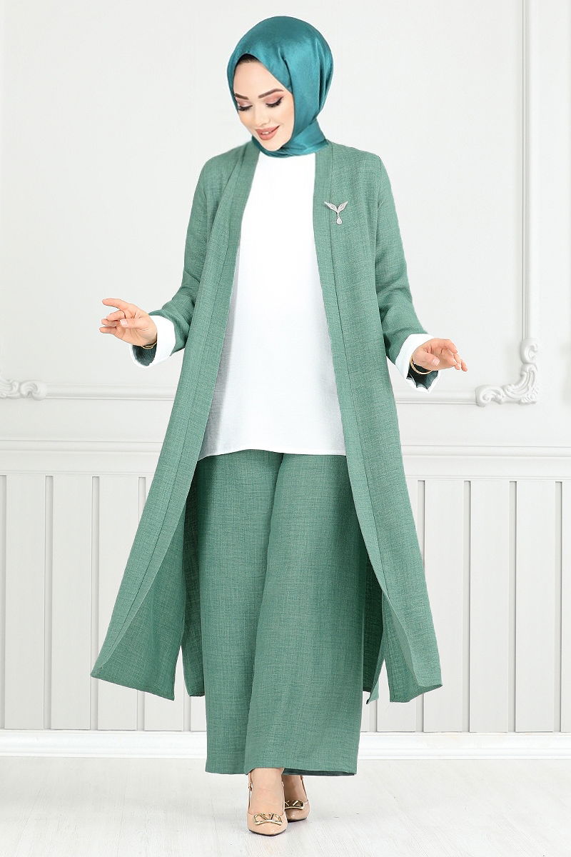 The stylish and practical Slit Triple Set is a modest wear model that can be comfortably chosen for all seasons. Washable at 30 degrees on a gentle cycle, this product is made from breathable Sofia Linen fabric. Featuring a jacket collar and slit details, this set offers a liner-free and comfortable wearing experience. The elasticated waist of the pants ensures a comfortable fit. This triple set includes a cape, blouse, and trousers.