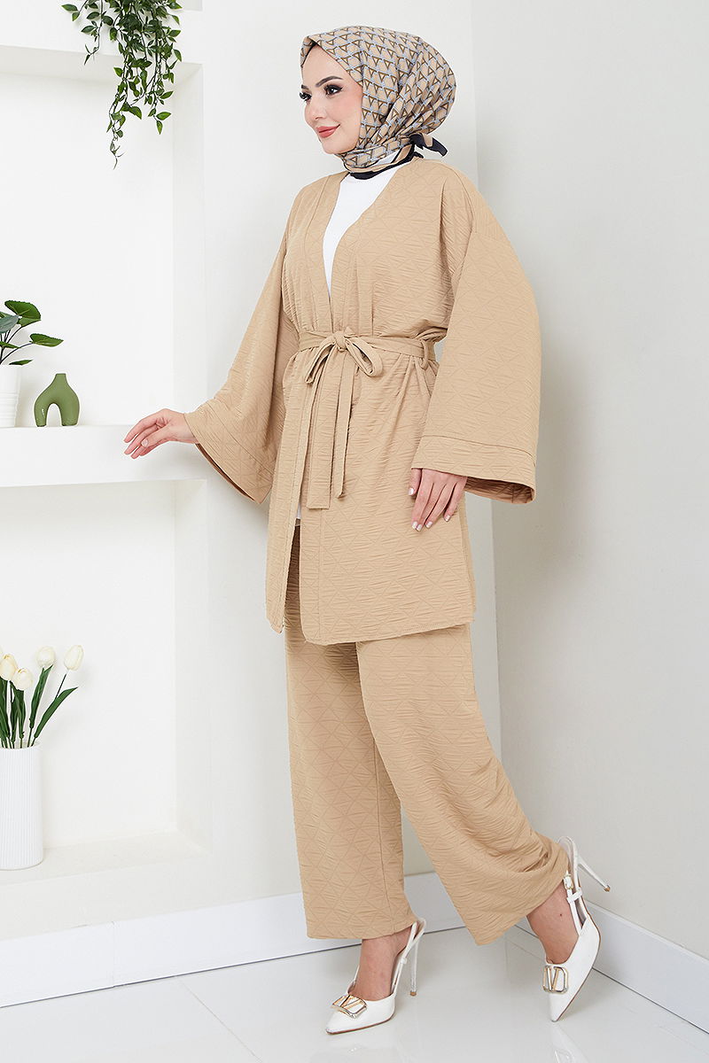 Quilted Detail Three-Piece Set model modest wear. Can be used in Autumn and Winter season. Should be washed at 30 degrees without spinning. Made of first class quilted fabric. The product has a Jacket collar. It does not have lining. (The product on the model is size S.) Sleeveless inner blouse. The two ends of the belt are sewn to prevent flapping, and the middle part is left empty (seamless). The belt is included with the product and can be optionally used. The waist of the pants is elasticized.