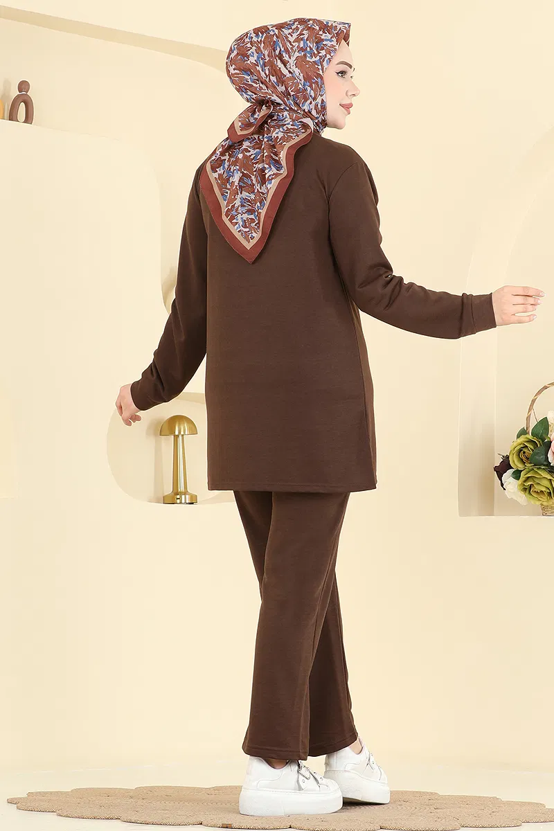 The Arma Detailed Double Set KOMBIN is a hijab garment suitable for use in all four seasons. Recommended for delicate wash, this product can be washed at 30 degrees Celsius. Made from dual-thread fabric, it features a bicycle collar design. The tunic offers freedom of movement with its side slit detail, while the elastic waist of the pants provides comfort. The product completes your elegance with its badge detail, while its lining-free structure makes it light and practical.
