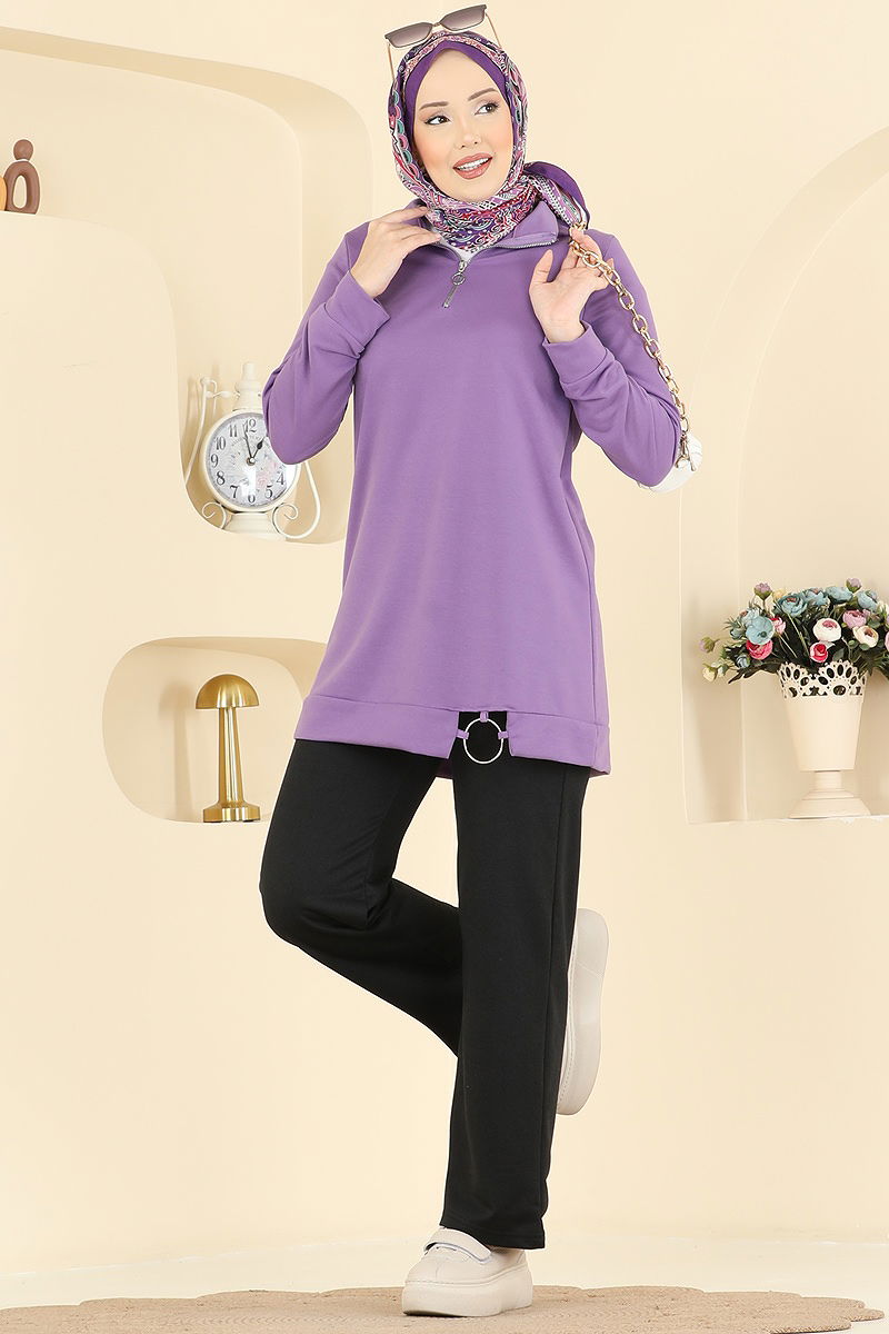 Half-Zip Sports Suit model is a hijab product. It can be used in all seasons. It should be washed at 30 degrees without squeezing. It is made of first-class Two-Thread fabric. The product has a dominant collar. It is unlined. The product has a front zip. (The product on the model is size 38.) It has a usable half-zip in the front. Metal non-tarnishing accessory. The pants have an elastic waist.