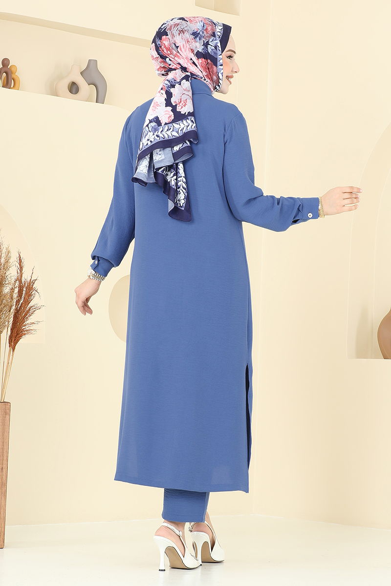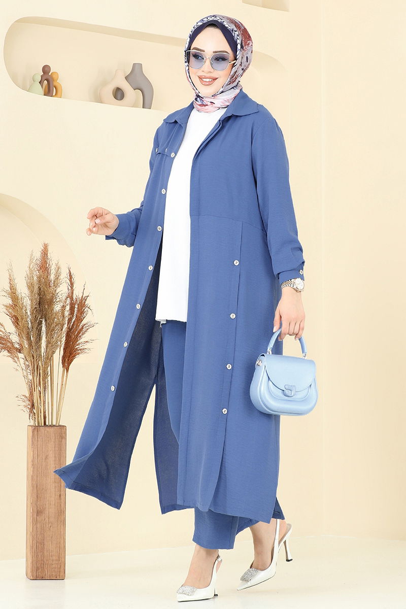 The Side Slit Aerobin Suit, tailored for the modest fashion style with the model, offers comfort in all seasons. This suit, which can be delicately washed and is suitable for washing at 30 degrees, is made from aerobin fabric. With hidden button details and slit button accessories, it enhances elegance while the elastic waistband on the pants increases comfort. Its unlined structure and active cuff buttons make it both stylish and practical.