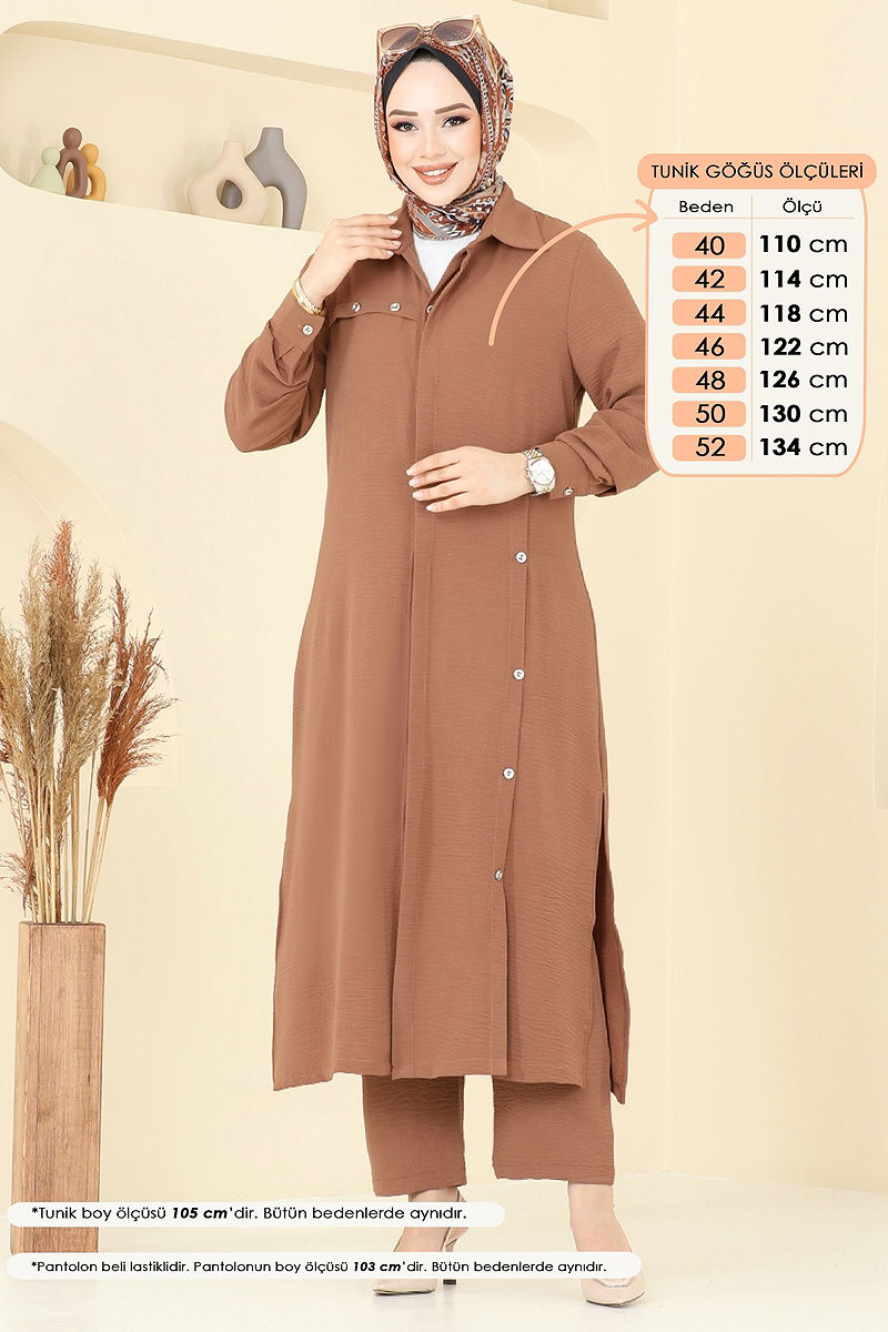 Product Feature : It is a new season hijab fashion product. The product has a Shirt collar. The product has Secret buttons. Slach buttons are an accessory.. Unlined. Buttons are accessories. Blouse is not included. Sample combination is made with the blouse to show the intended use of the product. Pocket available. The waist of the trousers is elastic. Cuff buttons are active. There may be a tonal difference in the product due to concept photo shoots.