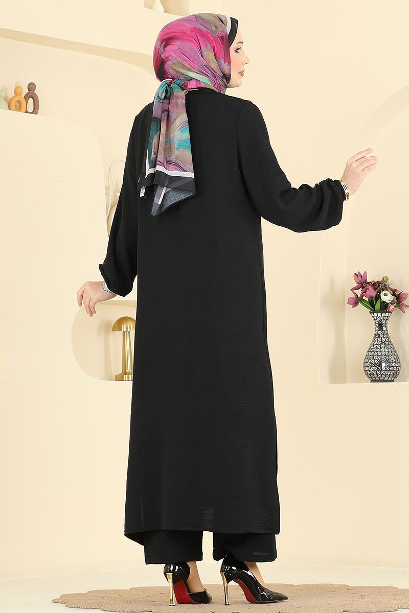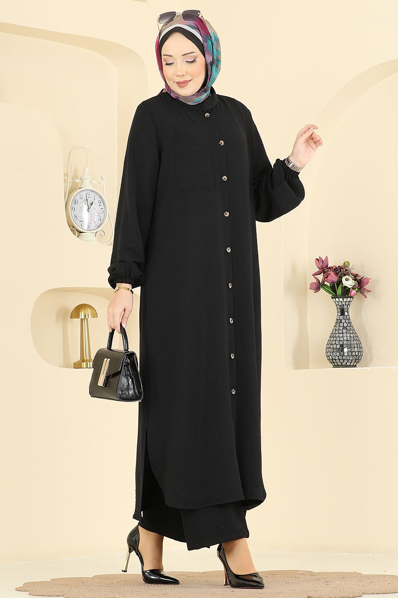 المنتج لديه ياقة نصف بيضوية. المنتج به أزرار من الأمام. البلوز تحتوي على فتحة. غير مبطنة. البلوزة غير متضمنة. صُنعت عينة من المجموعة مع البلوزة لإظهار الاستخدام المقصود للمنتج. الجيب الصدري نشط. خصر البنطال مرن. السوار مطاطي. قد يكون هناك اختلاف في الدرجة اللونية في المنتج بسبب التقاط الصور الفوتوغرافية.