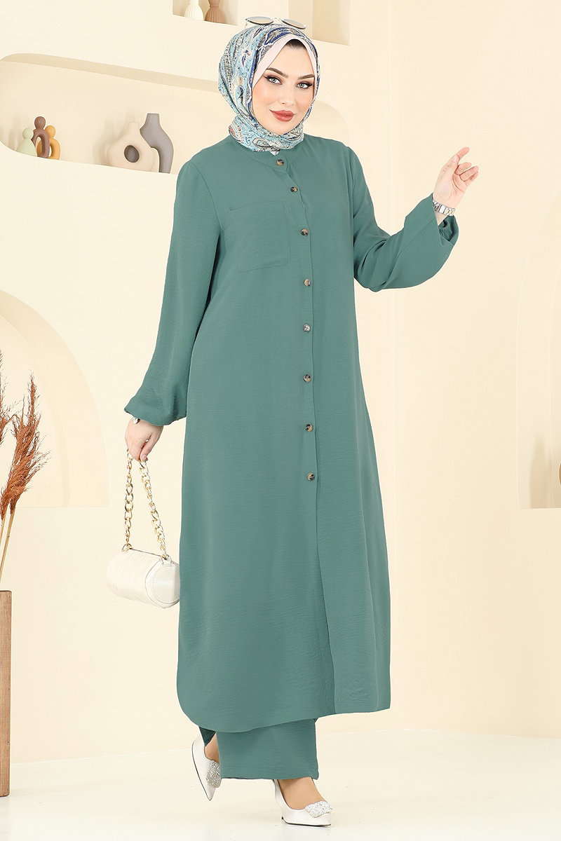 المنتج لديه ياقة نصف بيضوية. المنتج به أزرار من الأمام. البلوز تحتوي على فتحة. غير مبطنة. البلوزة غير متضمنة. صُنعت عينة من المجموعة مع البلوزة لإظهار الاستخدام المقصود للمنتج. الجيب الصدري نشط. خصر البنطال مرن. السوار مطاطي. قد يكون هناك اختلاف في الدرجة اللونية في المنتج بسبب التقاط الصور الفوتوغرافية.