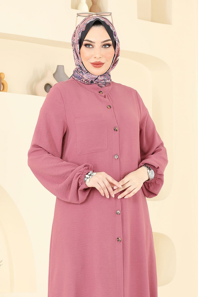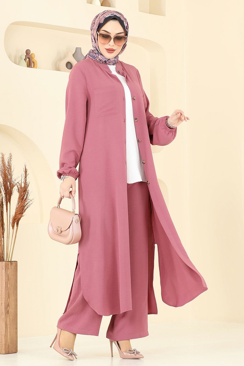 This Chest Pocket Detailed Modest Outfit is perfect for any season, made from aerobin fabric for utmost comfort. Suitable for gentle wash at 30 degrees, this garment features a semi-high collar and front-button design, merging elegance with ease. The side-slitted, lining-free tunic and stretchable waist pants with elastic cuffs ensure mobility and style. The active chest pocket in the tunic adds functionality. Exude grace and comfort with this exquisite modest outfit. (Product shown is a size 38.)