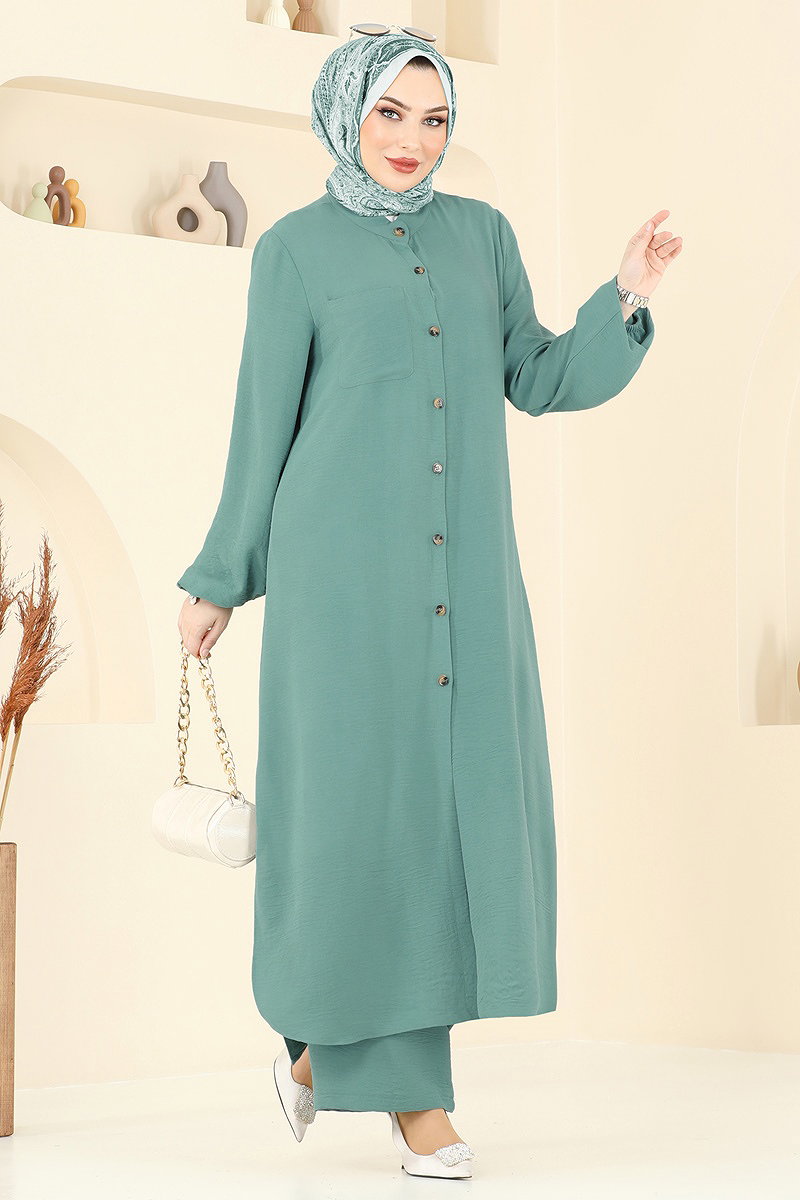 المنتج لديه ياقة نصف بيضوية. المنتج به أزرار من الأمام. البلوز تحتوي على فتحة. غير مبطنة. البلوزة غير متضمنة. صُنعت عينة من المجموعة مع البلوزة لإظهار الاستخدام المقصود للمنتج. الجيب الصدري نشط. خصر البنطال مرن. السوار مطاطي. قد يكون هناك اختلاف في الدرجة اللونية في المنتج بسبب التقاط الصور الفوتوغرافية.