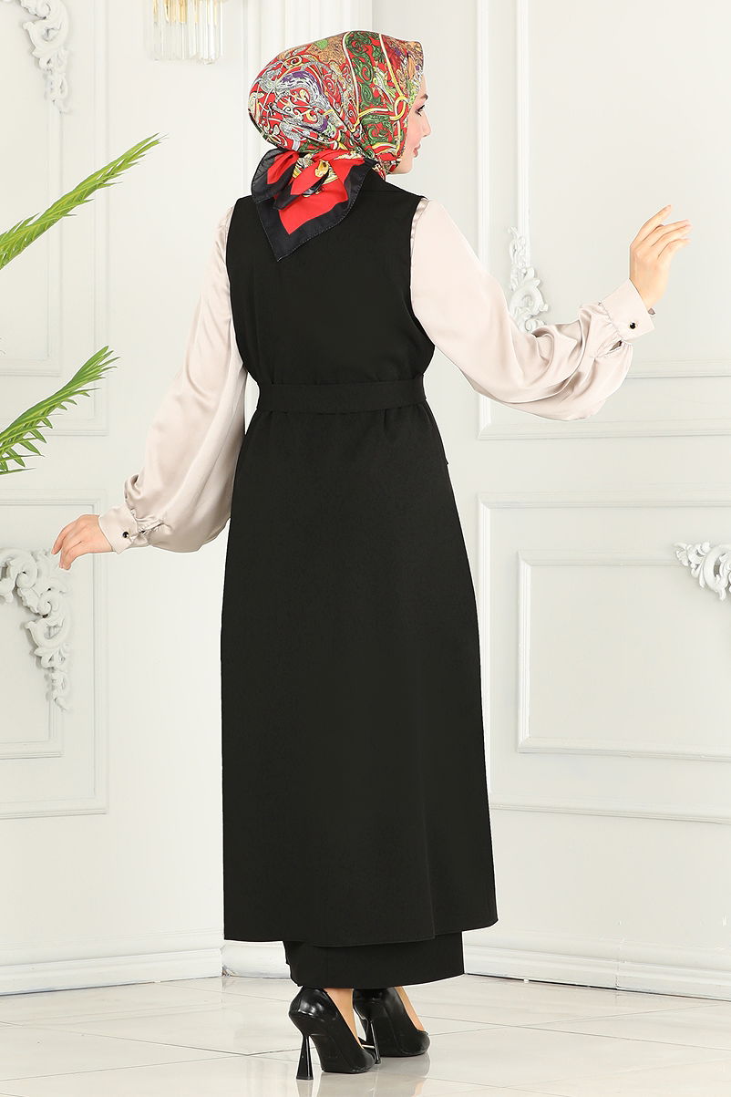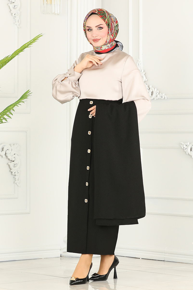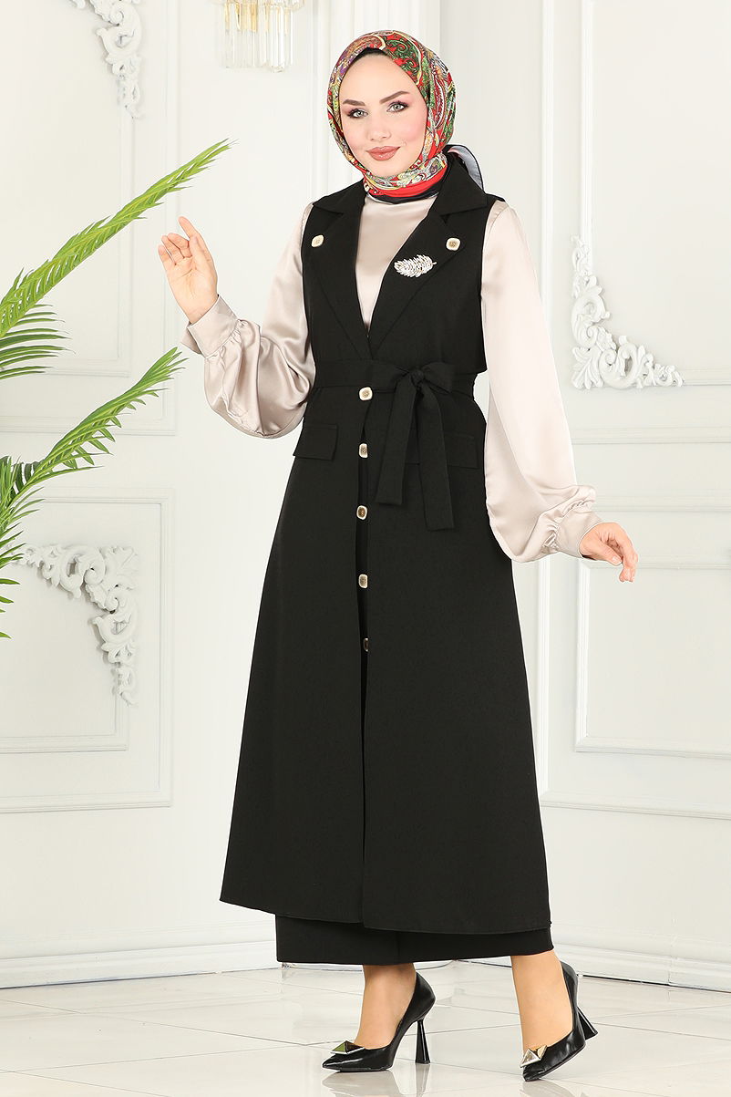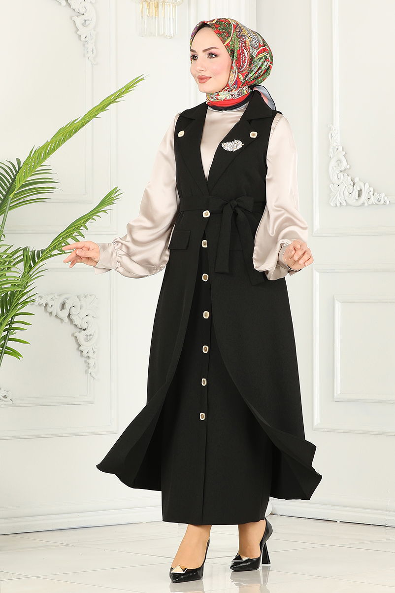 Product Feature : It is a new season hijab fashion product. The product has a Jacket collar. The product has From the front buttons. Unlined. Belt included, optional not available. Pocket detail is an accessory. The skirt waist is elastic. There may be a tonal difference in the product due to concept photo shoots.