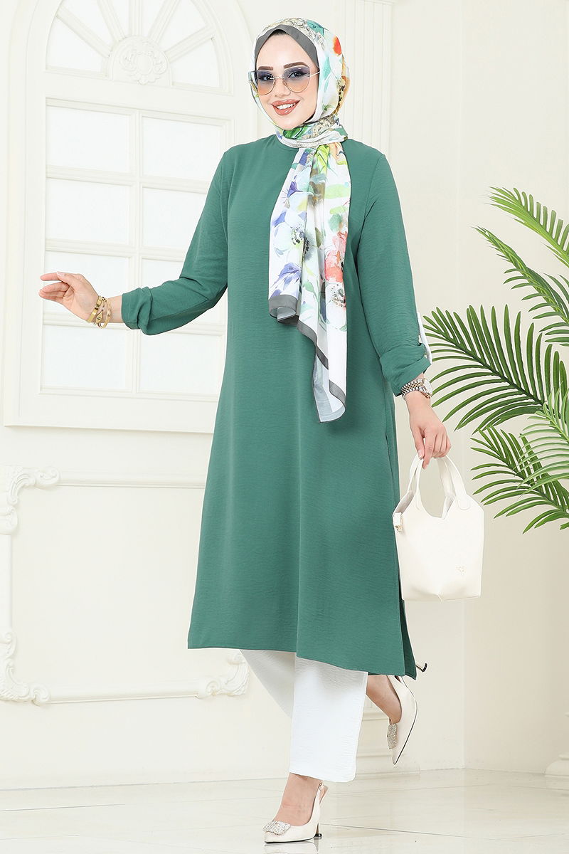 Product Feature : It is a new season hijab fashion product. The product is worn on the head. The product has a Cycling collar. The tunic has a side slash.. Unlined. Accessories are not included. The waist of the trousers is elastic. Cuff buttons are active. There may be a tonal difference in the product due to concept photo shoots.