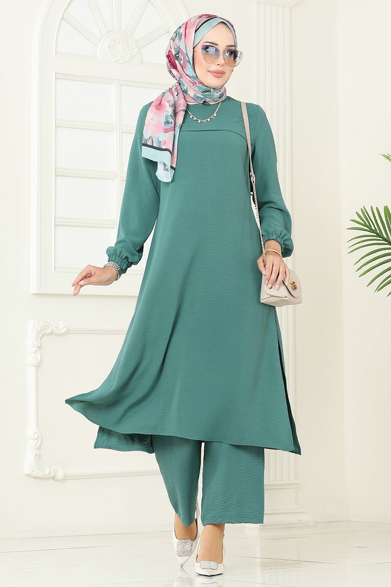 Product Feature : It is a new season hijab fashion product. The product has a Cycling collar. The tunic has a side slash.. Unlined. The waist of the trousers is elastic. The cuff is rubberized. There may be a tonal difference in the product due to concept photo shoots.