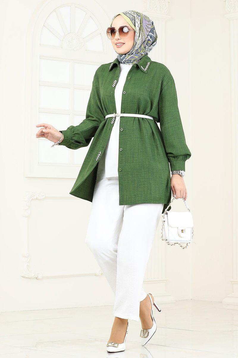 المنتج لديه ياقة القميص. المنتج به أزرار من الأمام. البلوز تحتوي على فتحة. غير مبطنة. التفاصيل الحجرية محفورة. الحزام غير متضمن. خصر البنطال مرن. أزرار الكفة نشطة. قد يكون هناك اختلاف في الدرجة اللونية في المنتج بسبب التقاط الصور الفوتوغرافية.